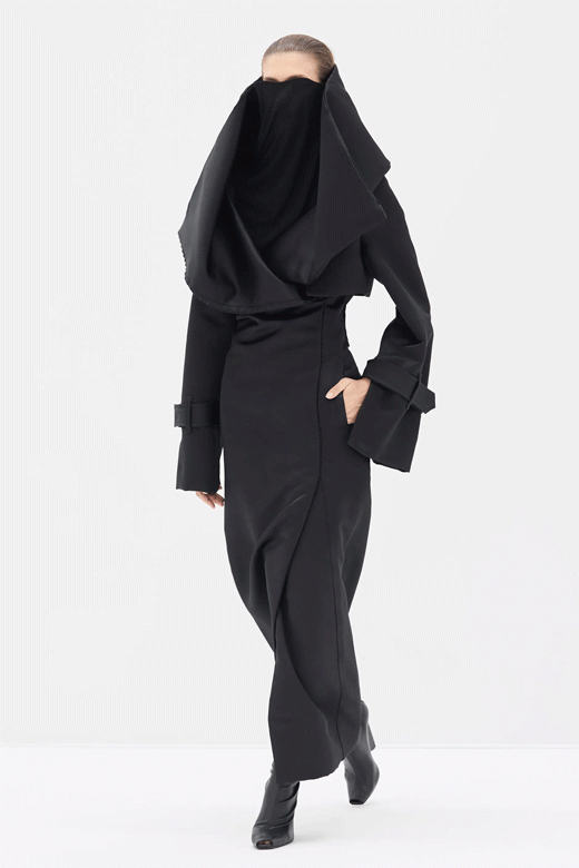 Η επίδειξη ξεκίνησε με δραματικό τρόπο, τα πρόσωπα των μοντέλων να καλύπτονται από γιγάντια όρθια κολάρα, από ασυνήθιστα γυαλιά δεμένα με μαύρα υφάσματα, πυκνή δαντέλα αντί για φακούς, αφήνοντας εκτεθειμένα μόνο τα μέτωπα τους.