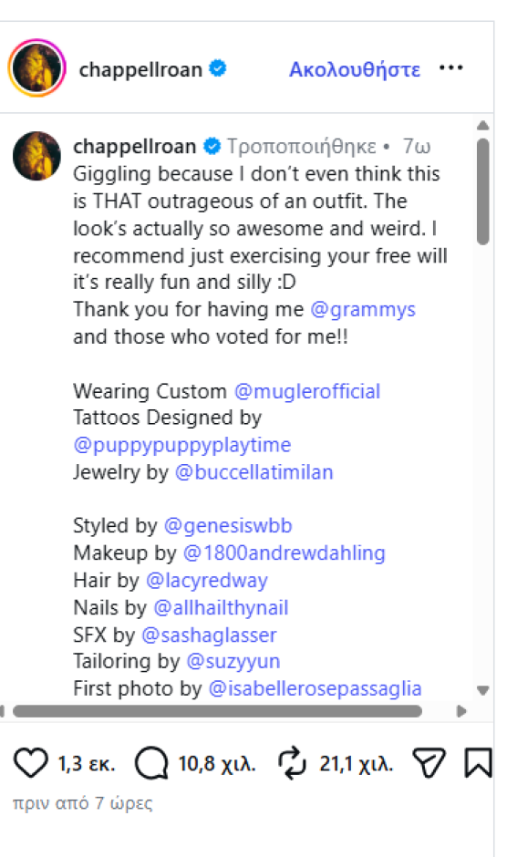 Συγκεκριμένα έγραψε: «Γελάω γιατί δεν νομίζω ότι είναι ΤΟΣΟ εξωφρενικό. Το look είναι πραγματικά τόσο φοβερό και παράξενο. Σας προτείνω να ασκείτε ελεύθερα τη βούλησή σας, είναι πραγματικά διασκεδαστικό και ανόητο. Σας ευχαριστώ που με καλέσατε @grammys και όσους με ψήφισαν!!».