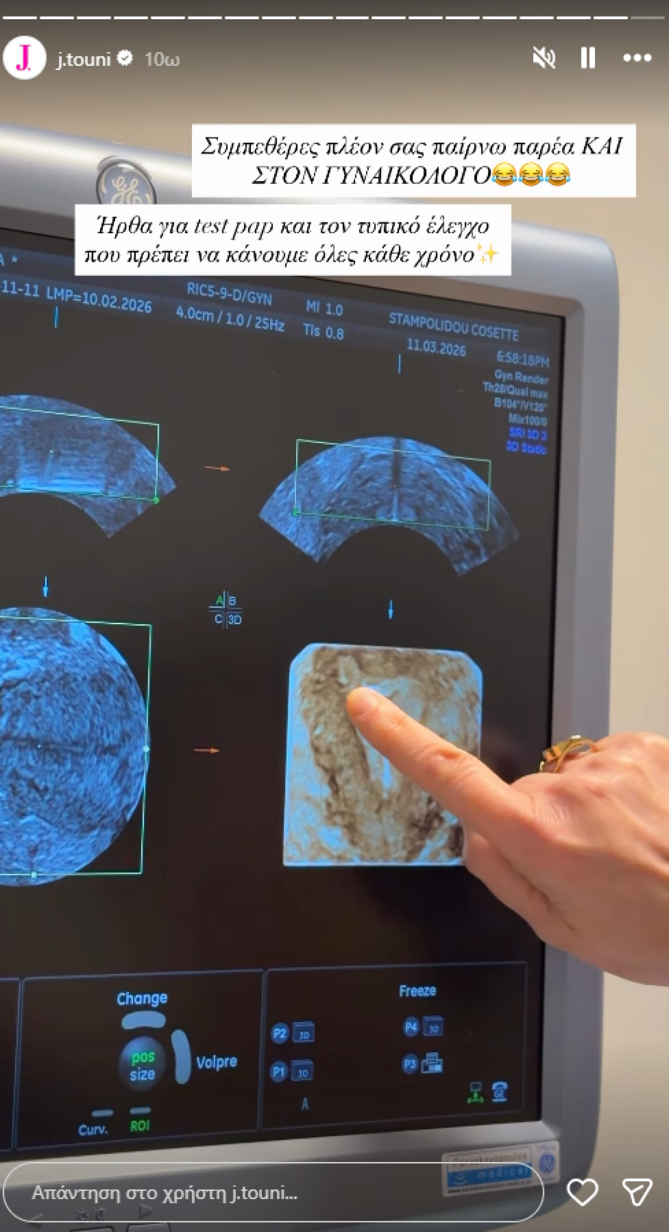 «Συμπεθέρες πλέον σας παίρνω παρέα και στον γυναικολόγο. Ήρθα για test pap και τον τυπικό έλεγχο που πρέπει να κάνουμε όλες κάθε χρόνο», έγραψε η ίδια στην πρώτη της ανάρτηση.