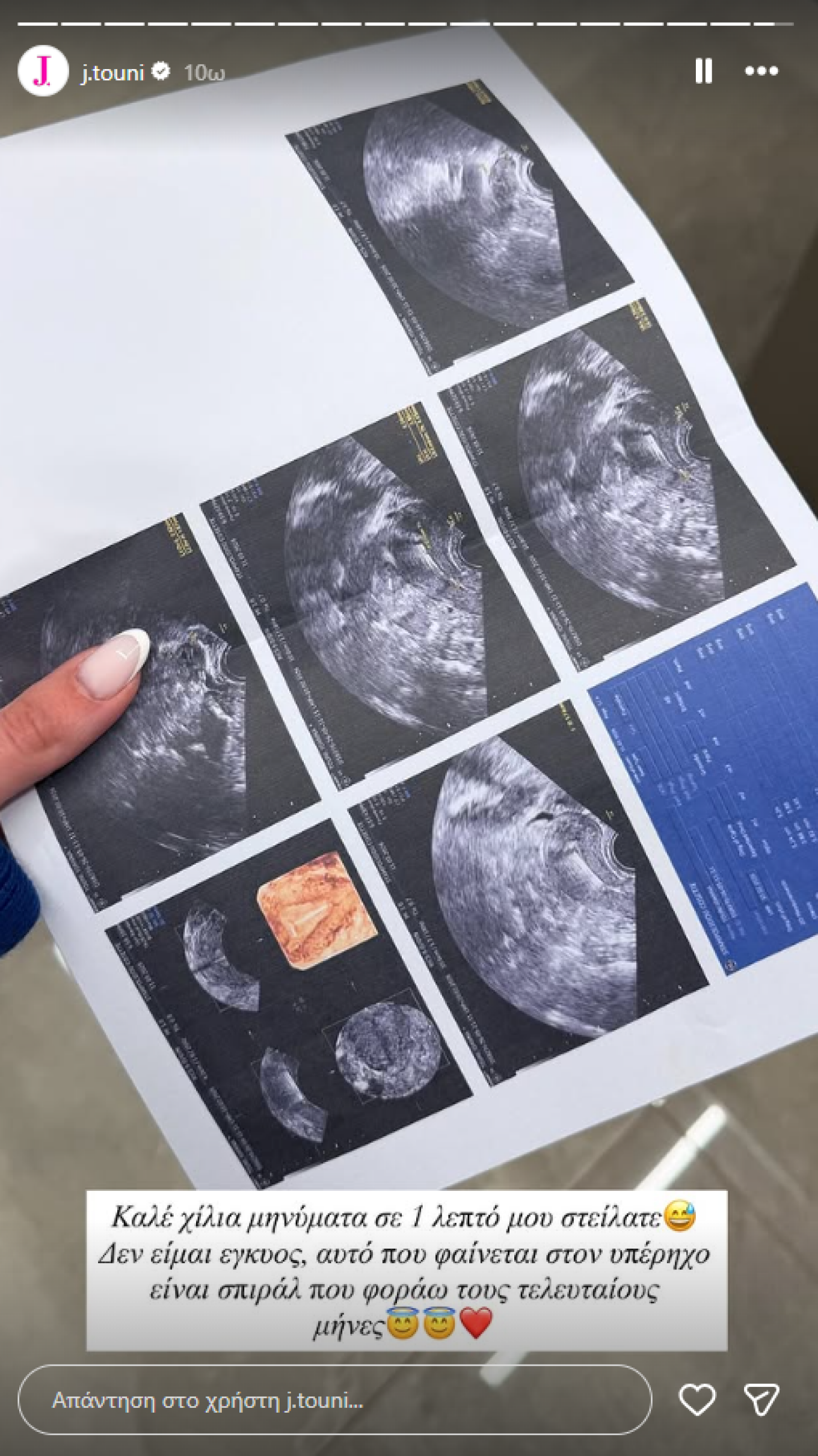 Σοκαρισμένη η Ιωάννα απάντησε στις φήμες, γράφοντας: «Καλέ χίλια μηνύματα σε 1 λεπτό μου στείλατε. Δεν είμαι έγκυος, αυτό που φαίνεται στον υπέρηχο είναι σπιράλ που φοράω τους τελευταίους μήνες».
