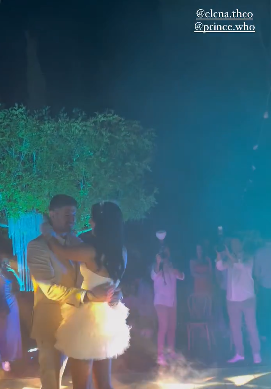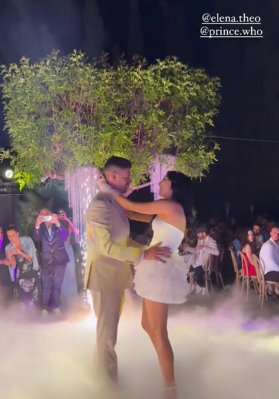 Το νεονύμφιο ζευγάρι έκανε μια δυναμική είσοδο στον χώρο του γαμήλιου πάρτι με καπνούς και τύμπανα, ενώ για τον πρώτο τους χορό επέλεξαν το τραγούδι "Ερωτευμένος" του Νίκου Βέρτη.