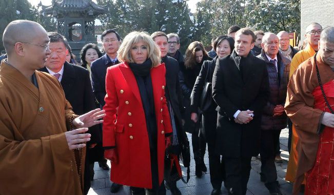 Η ίδια στο ταξίδι της στην Κίνα, με τον σύζυγό της Emmanuel Macron, επέλεξε να φορέσει ένα κατακόκκινο midi παλτό, όπου το συγκεκριμένο χρώμα συμβολίζει τη καλοτυχία στη Κίνα. Όπως φαίνεται ήθελε να μεταφέρει λίγη καλή ενέργεια με την επιλογή της. Συνδυάζοντας το με ε ένα total black look έτσι ώστε να δώσει ακόμα περισσότερη έμφαση στο χρώμα. διάλεξε ένα μαύρο δερμάτινο παντελόνι, σε συνδυασμό με ένα μαύρο πουλόβερ και ένα μαύρο κασκόλ Louis Vuitton.