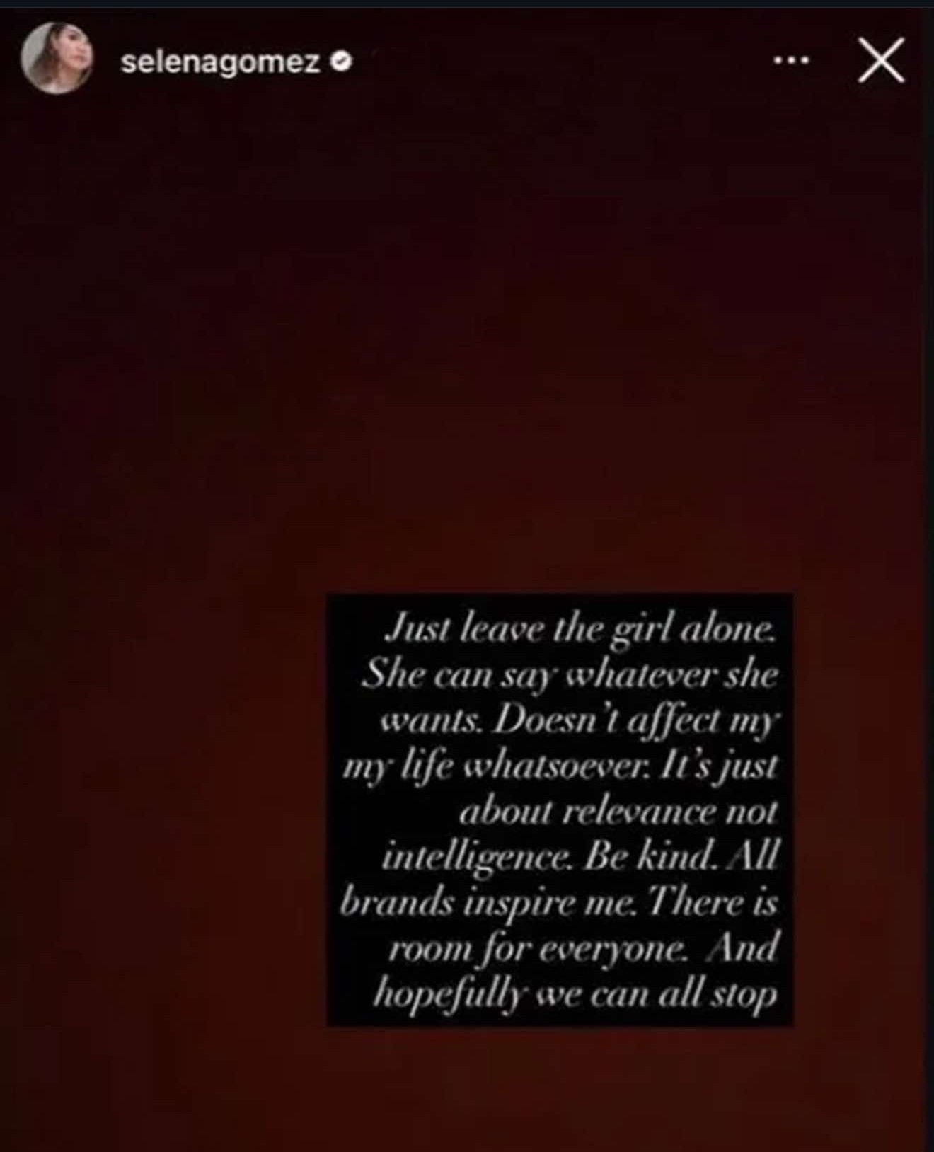 «Μπορεί να λέει ό,τι θέλει. Δεν επηρεάζει τη ζωή μου καθόλου. Το θέμα είναι η προβολή, όχι η νοημοσύνη», έγραψε η Gomez στην ανάρτησή της, η οποία είχε έναν ελαφρώς ειρωνικό τόνο, συνεχίζοντας: «Όλα τα brands με εμπνέουν. Υπάρχει χώρος για όλους. Και ελπίζω κάποια στιγμή να σταματήσουμε».