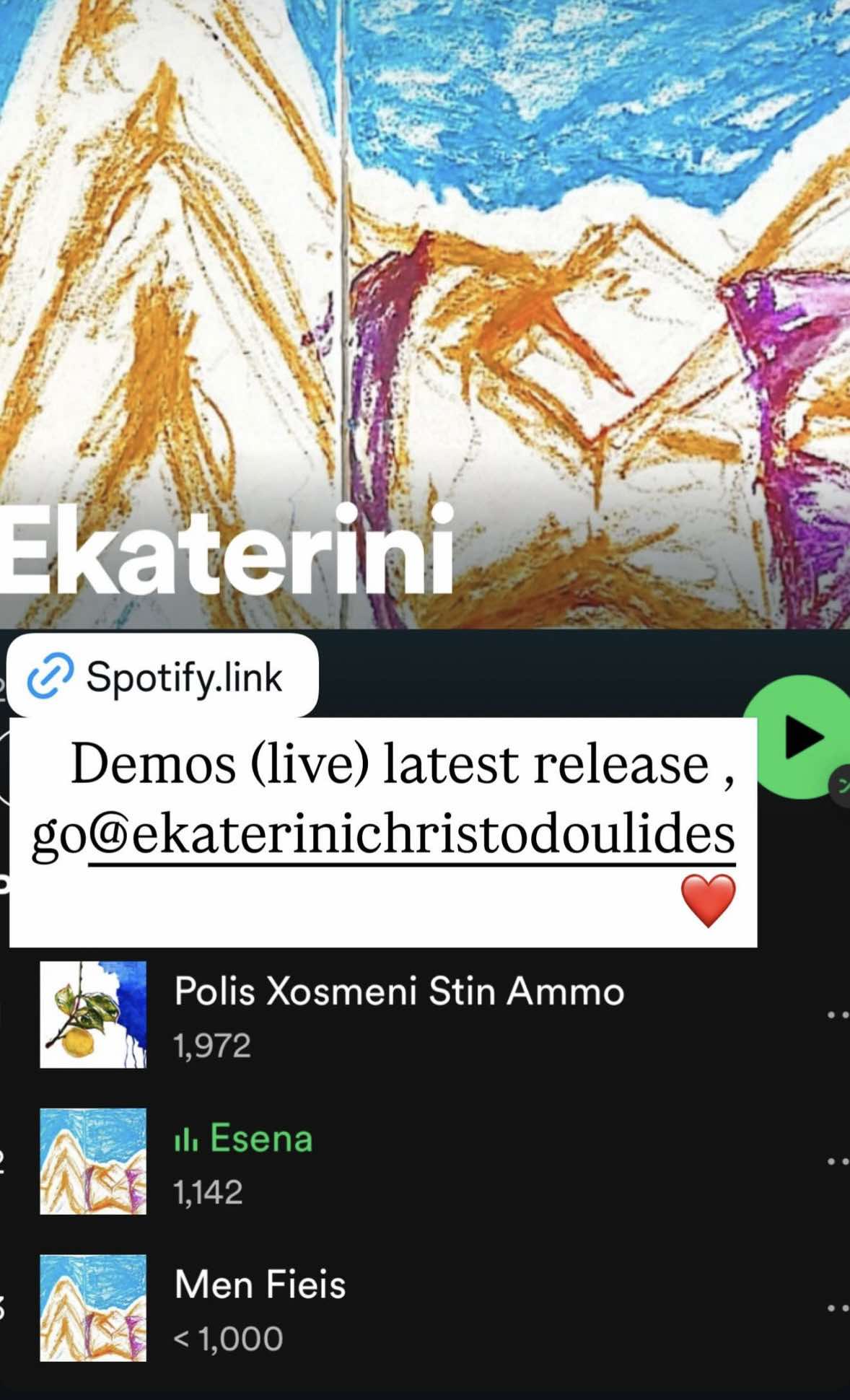 Η νεαρή δημιουργός υπογράφει τόσο τους στίχους όσο και την ερμηνεία, αποδεικνύοντας πως η μουσική της πορεία βασίζεται στο ταλέντο και το προσωπικό της όραμα. Τα νέα τραγούδια της Αικατερίνης Χριστοδουλίδη είναι ήδη διαθέσιμα στο Spotify και όπως όλα δείχνουν, η Κύπρος απέκτησε μια νέα, ταλαντούχα φωνή που έχει πολλά ακόμα να πει.