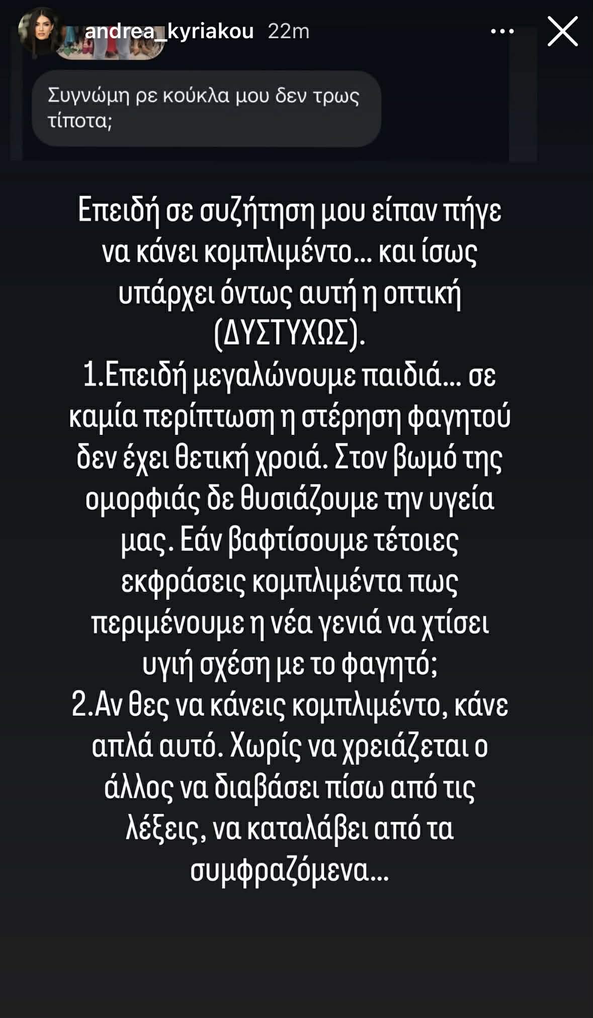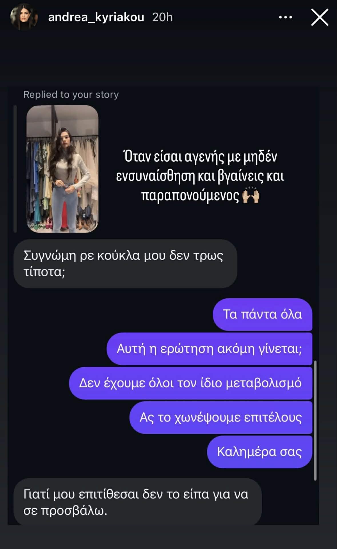 Η Άντρεα Κυριάκου βρέθηκε στο επίκεντρο σχολιασμού για την εμφάνισή της, έπειτα από μήνυμα που έλαβε στον προσωπικό της λογαριασμό στο Instagram. Συγκεκριμένα, χρήστης της έγραψε: «Συγγνώμη, ρε κούκλα μου δεν τρως τίποτα;», εστιάζοντας στα κιλά της. Στη συνέχεια, το ίδιο account υποστήριξε πως δεν υπήρχε πρόθεση προσβολής, αφήνοντας να εννοηθεί ότι το σχόλιο είχε χαρακτήρα «κομπλιμέντου».