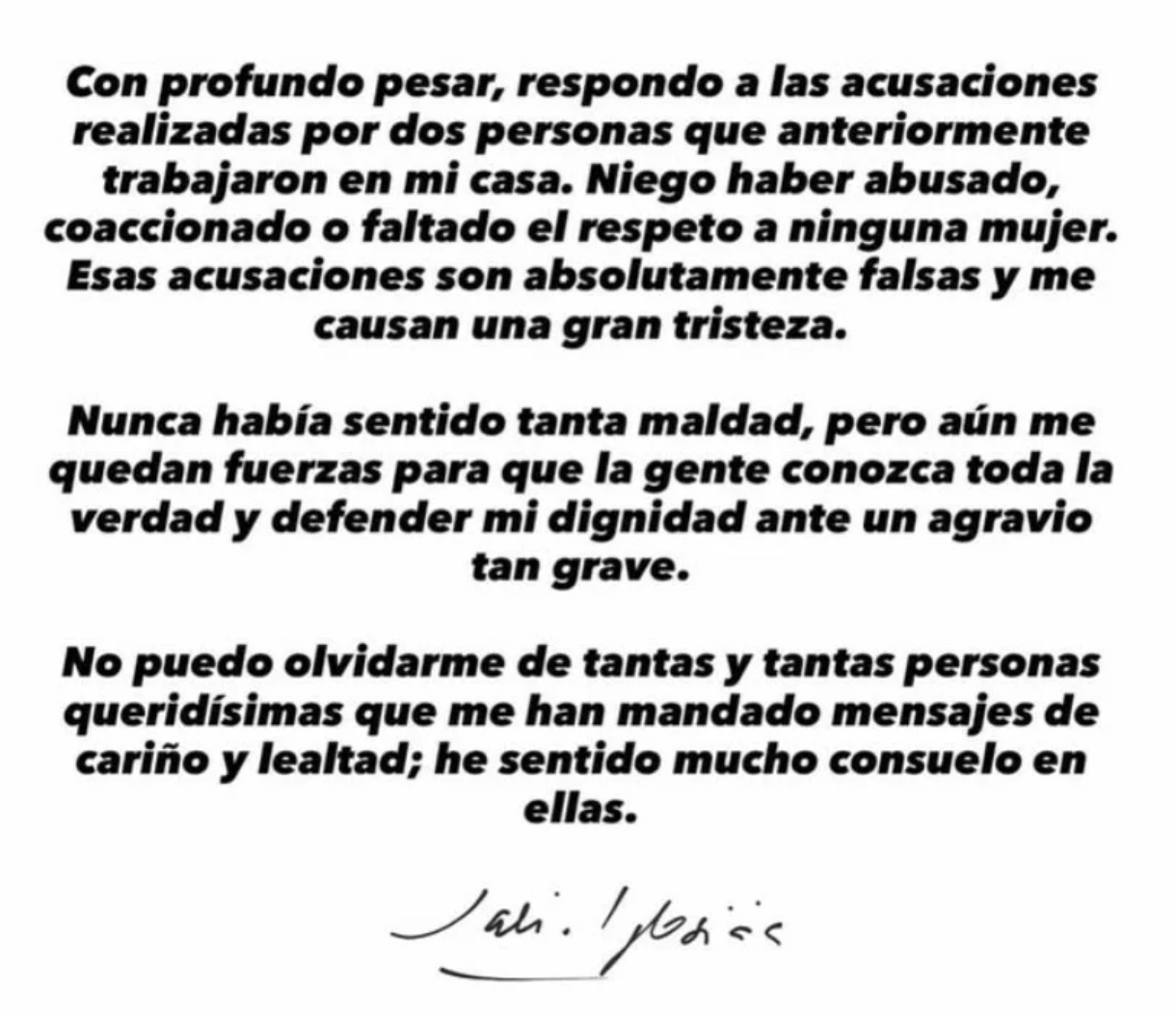 Σε ανάρτηση που έκανε στον προσωπικό του λογαριασμό στο Instagram ο τραγουδιστής αρνήθηκε της καταγγελίες αναφέροντας: «Με μεγάλη λύπη, απαντώ στις κατηγορίες δύο ατόμων που εργάζονταν στο σπίτι μου. Ποτέ δεν κακοποίησα, εξανάγκαζα ή έδειξα ασέβεια σε καμία γυναίκα. Αυτές οι κατηγορίες είναι απολύτως ψευδείς και με πονάνε βαθιά». Ο Iglesias προσθέτει ότι θα «υπερασπιστεί την αξιοπρέπειά του απέναντι σε αυτή τη σοβαρή προσβολή» και ευχαριστεί «τους τόσους πολλούς ανθρώπους για τα μηνύματα αγάπης και υποστήριξης».