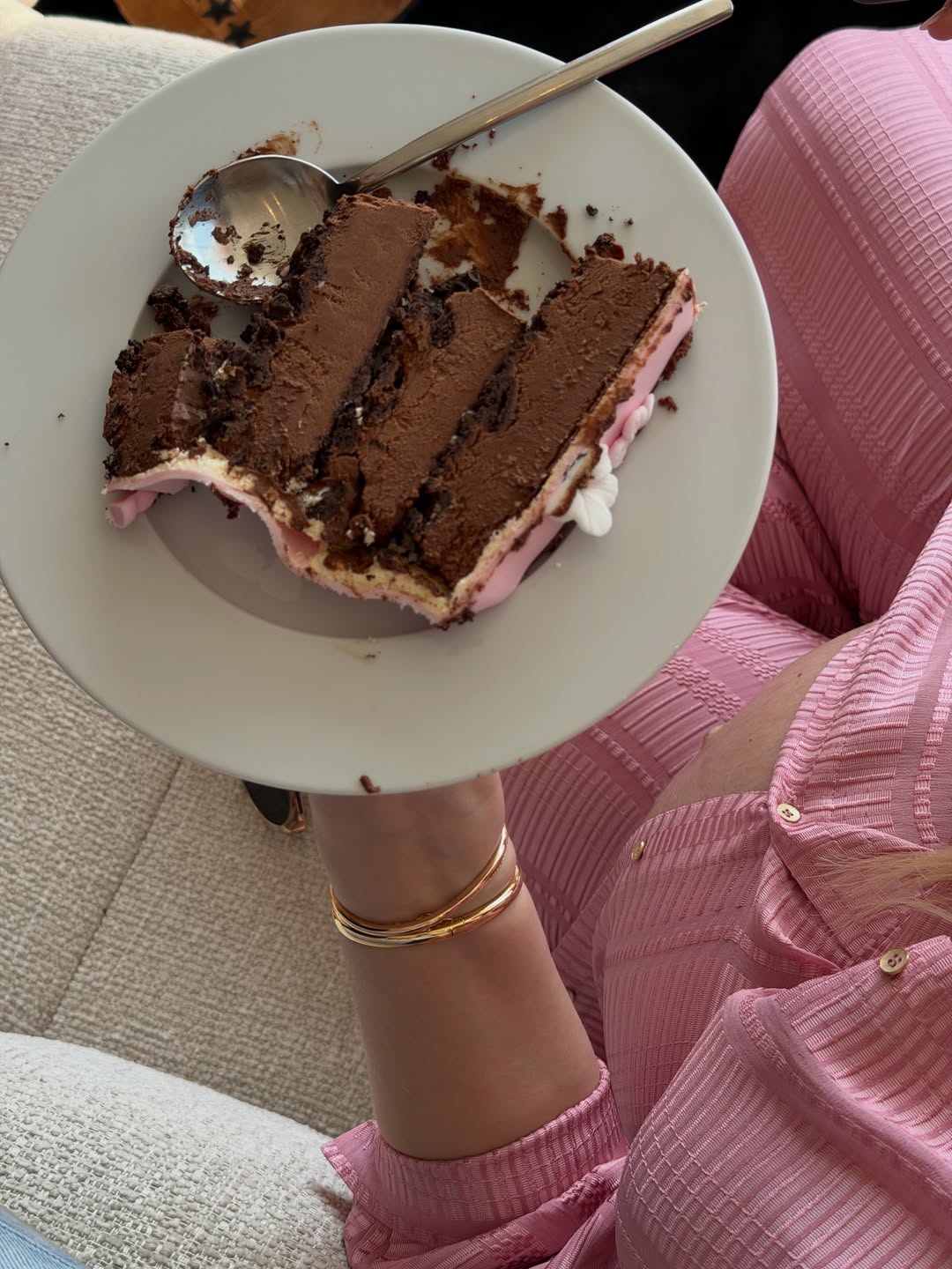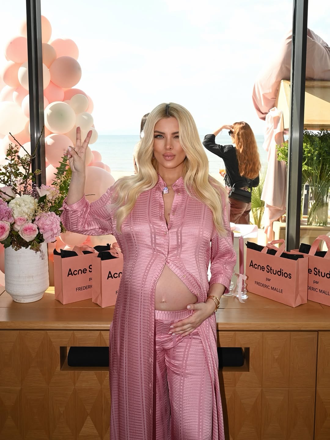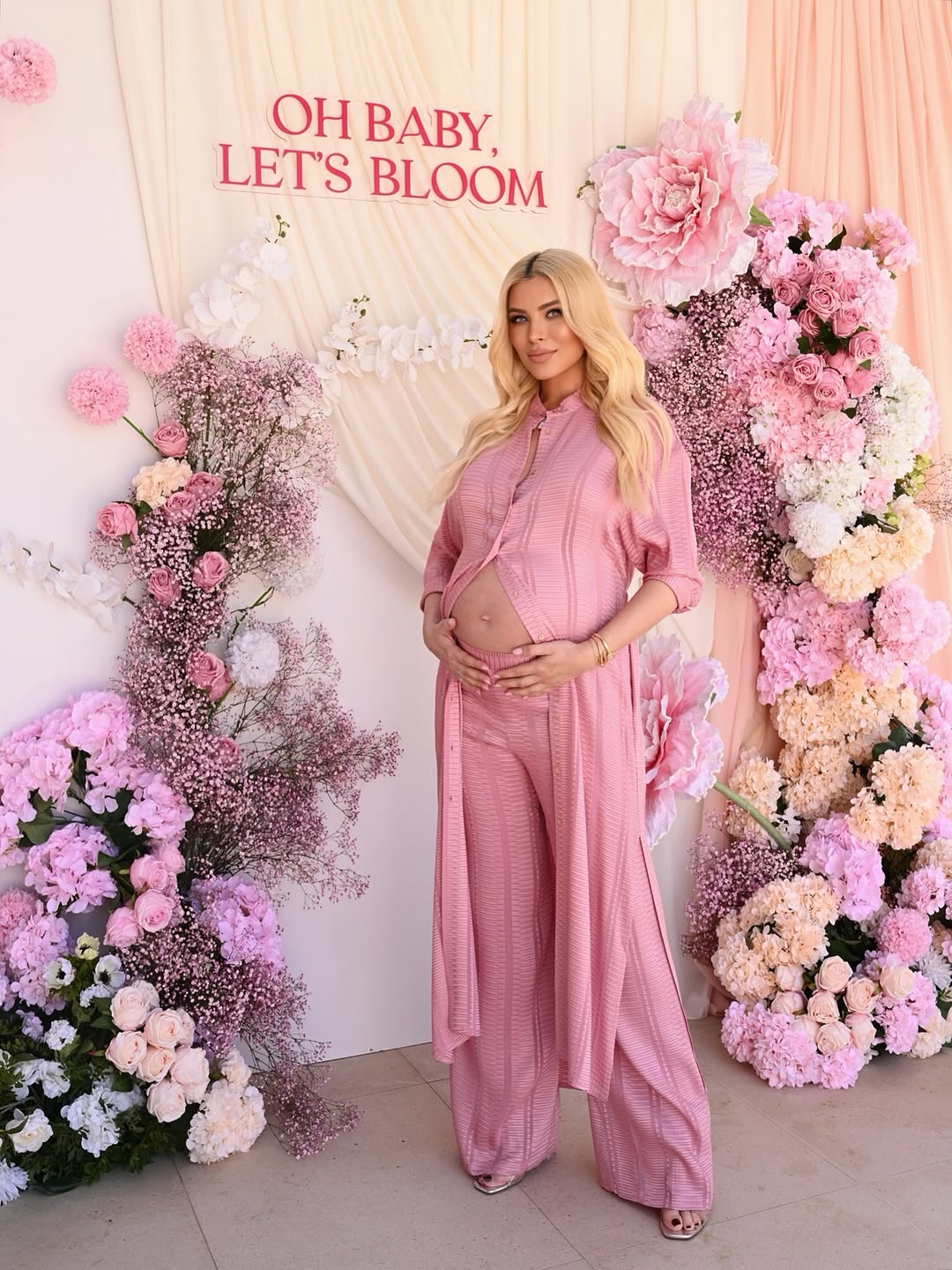 Η εγκυμονούσα παρουσιάστρια επέλεξε για τη συγκεκριμένη ημέρα ένα hot pink σύνολο από το brand Zeus & Dione. Το outfit αποτελείτο από φαρδιά παντελόνα και μακριά πουκαμίσα, την οποία άφησε ανοιχτή στο ύψος της κοιλιάς της, αναδεικνύοντας τη φουσκωμένη της σιλουέτα. Το look της συνδύασε με ένα ιδιαίτερο κόσμημα που έκλεψε τα βλέμματα, μια χρυσή χειροπέδα με χαραγμένο το όνομα της κόρης της.
