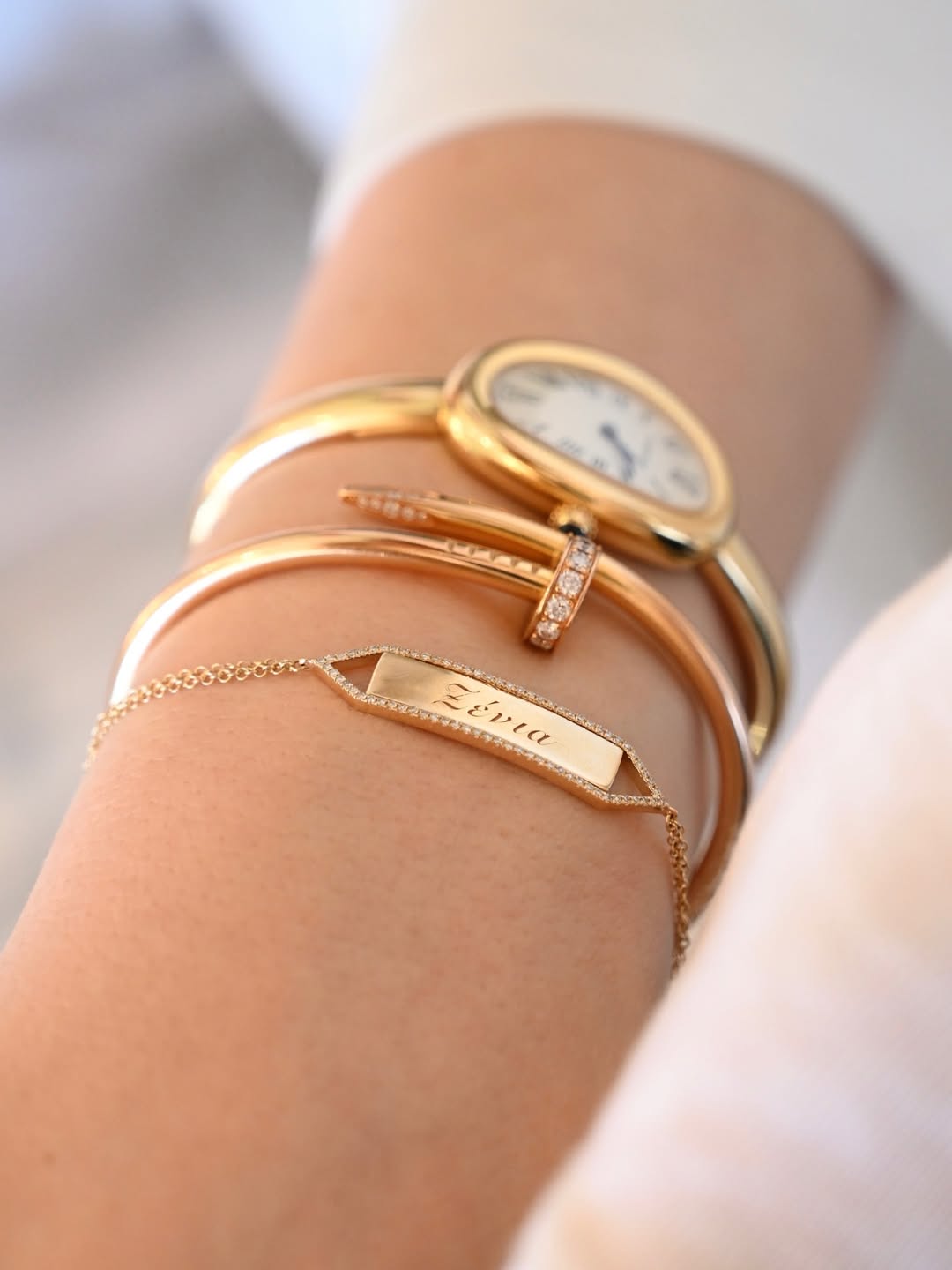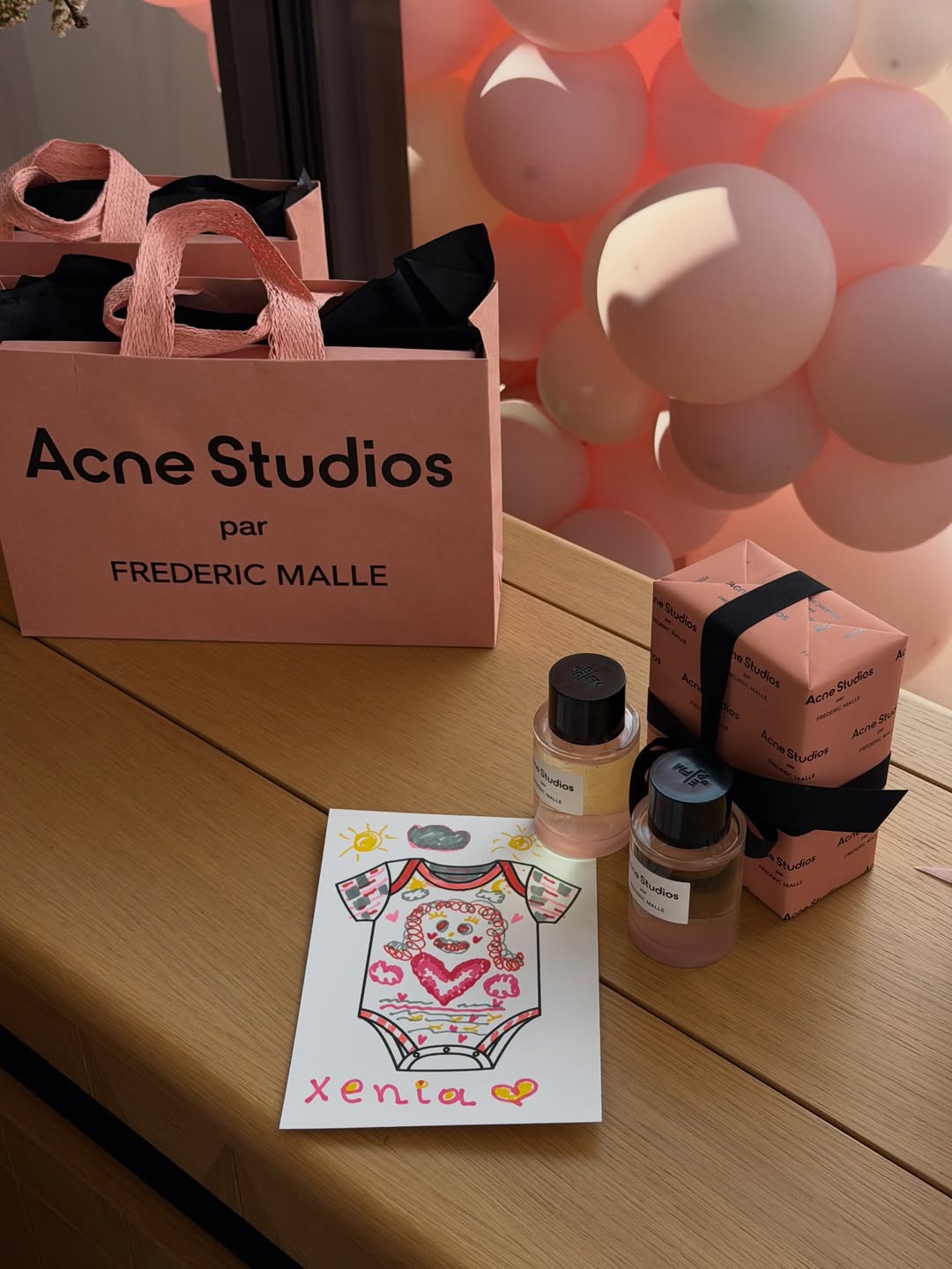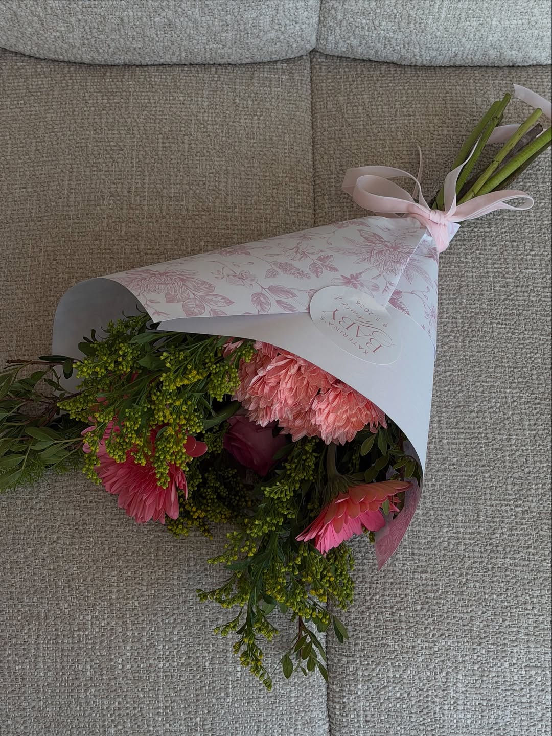 Η εγκυμονούσα παρουσιάστρια επέλεξε για τη συγκεκριμένη ημέρα ένα hot pink σύνολο από το brand Zeus & Dione. Το outfit αποτελείτο από φαρδιά παντελόνα και μακριά πουκαμίσα, την οποία άφησε ανοιχτή στο ύψος της κοιλιάς της, αναδεικνύοντας τη φουσκωμένη της σιλουέτα. Το look της συνδύασε με ένα ιδιαίτερο κόσμημα που έκλεψε τα βλέμματα, μια χρυσή χειροπέδα με χαραγμένο το όνομα της κόρης της.