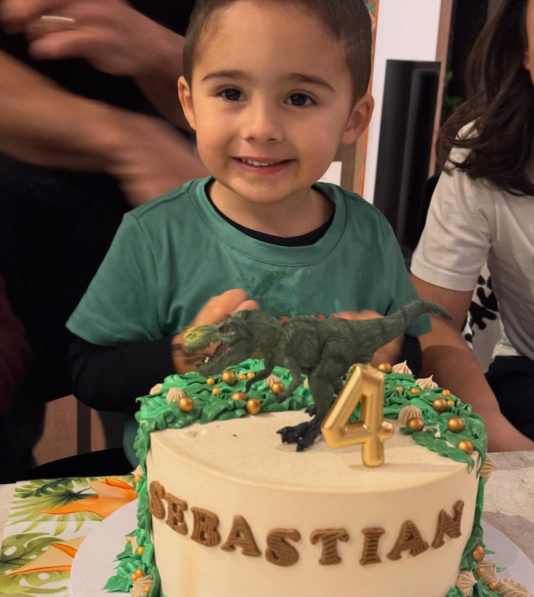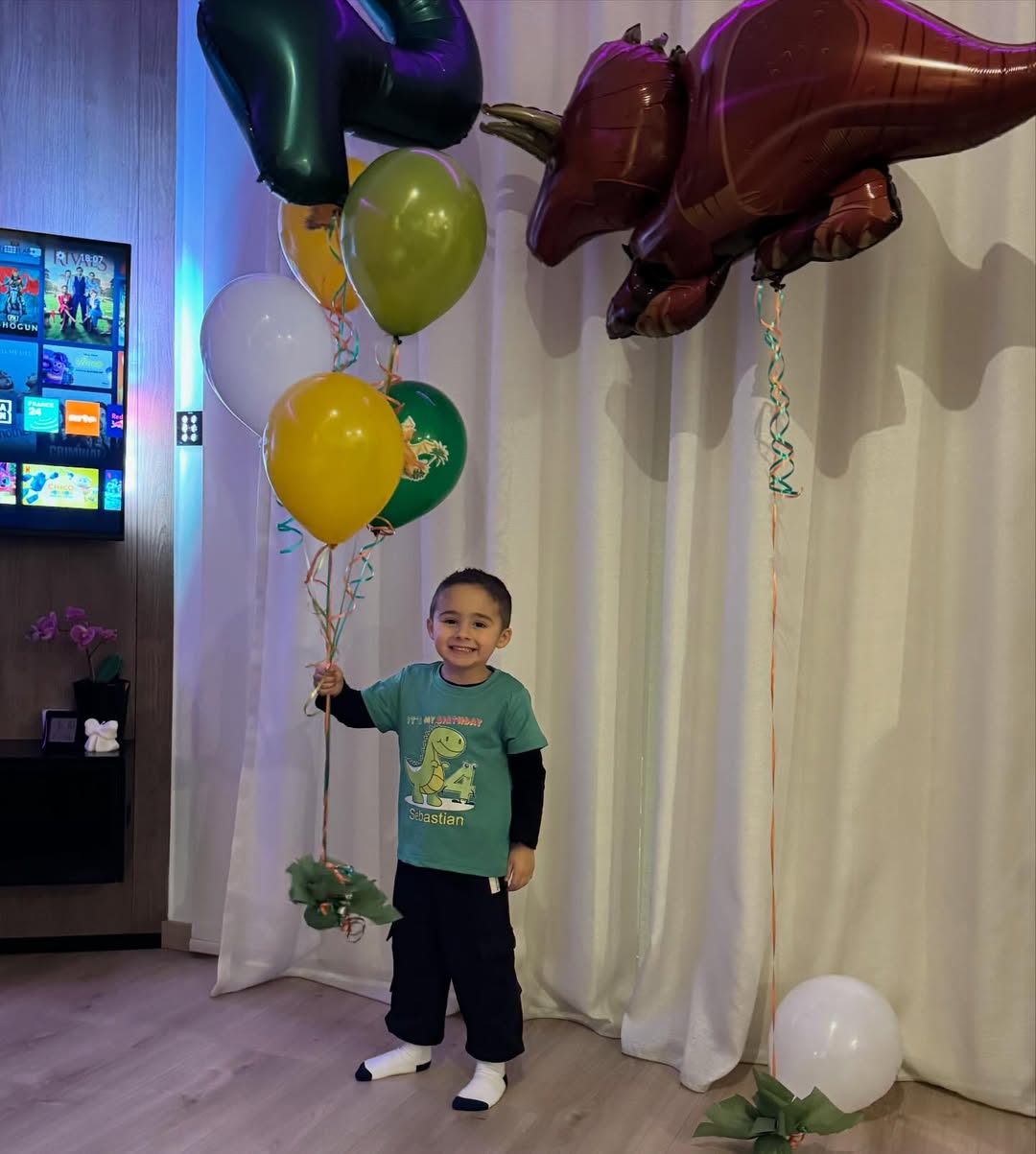 Τις εντυπώσεις έκλεψε η εντυπωσιακή τούρτα γενεθλίων με θέμα τους δεινόσαυρους, σε αποχρώσεις του πράσινου και του μπεζ, με το όνομα του Sebastian γραμμένο επάνω και έναν χαριτωμένο δεινόσαυρο να δεσπόζει στο σχέδιο. Το σκηνικό συμπλήρωσαν μπαλόνια σε διάφορα χρώματα, αλλά και μπαλόνια σε σχήμα δεινόσαυρων, δημιουργώντας μια παιχνιδιάρικη και απόλυτα παιδική ατμόσφαιρα.