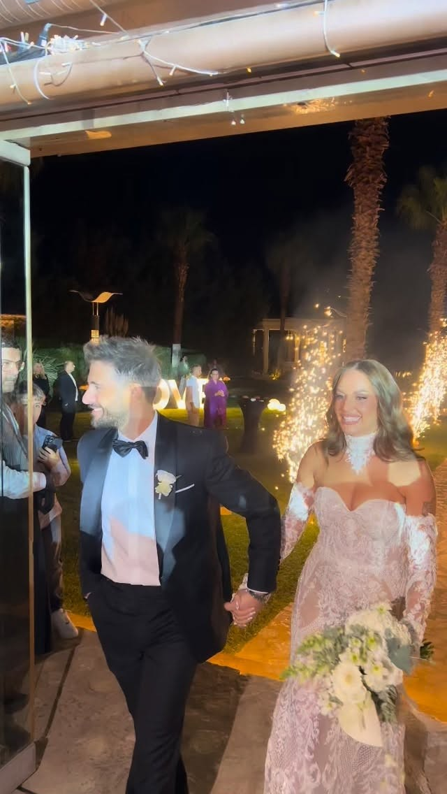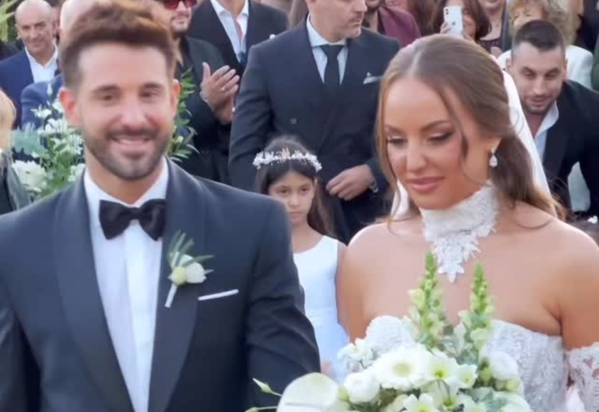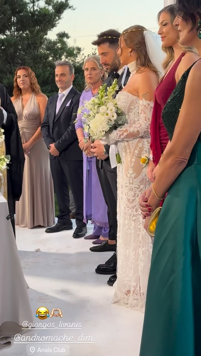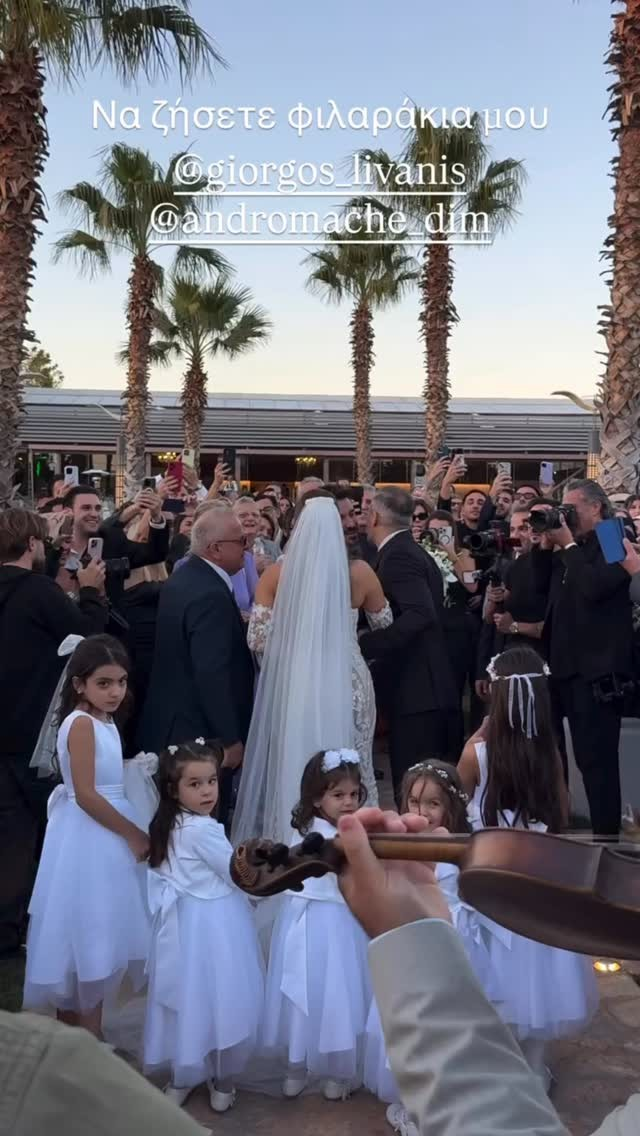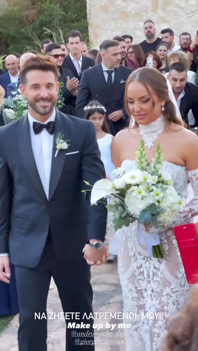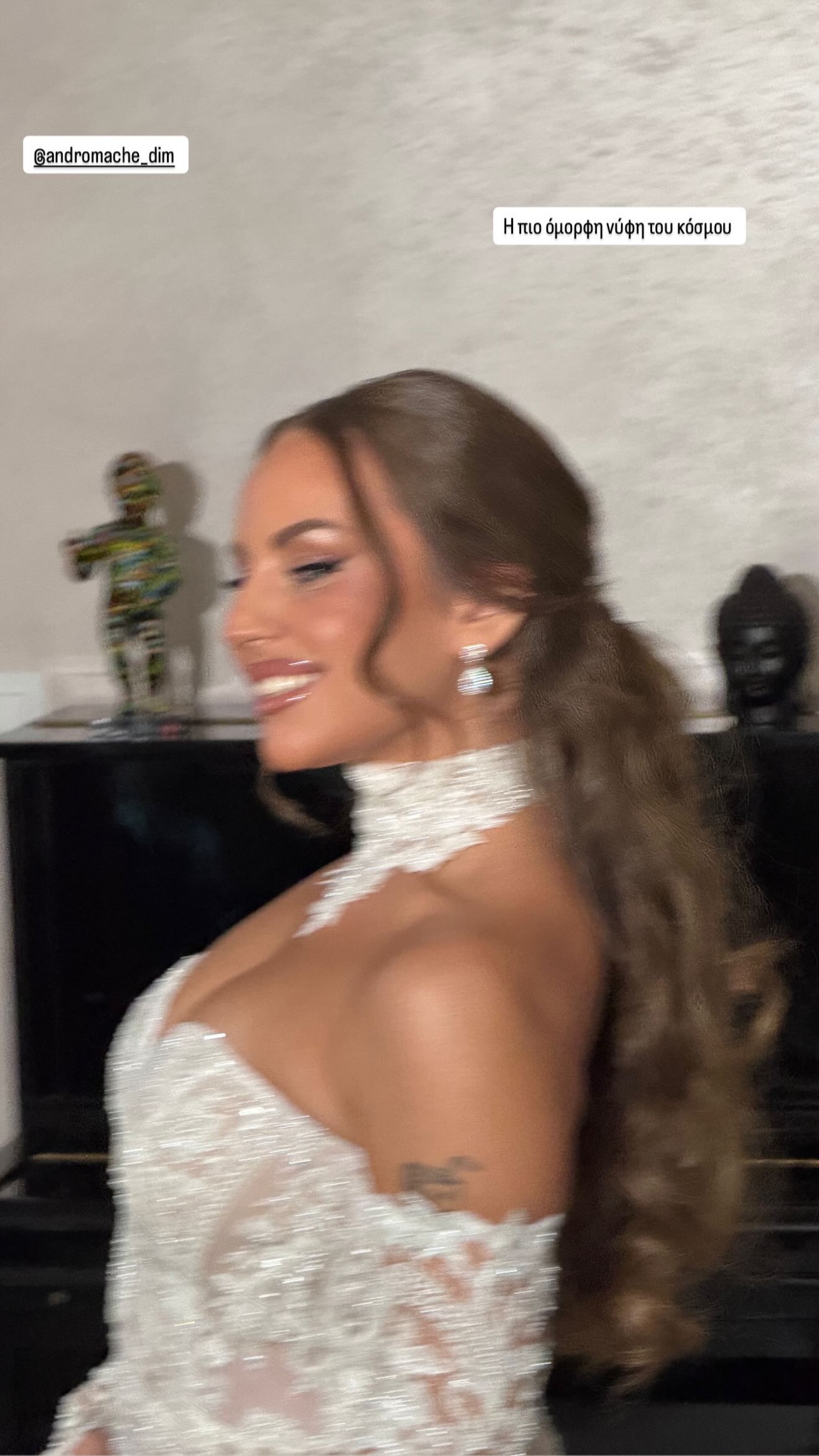 Η νύφη έλαμπε μέσα σε custom νυφικό του Βρεττού Βρεττάκου, ο ίδιος υπέγραψε και το φόρεμα της δεξίωσης. Το bridal make-up επιμελήθηκε η Σμαρώ Μανωλοπούλου σε ροζ τόνους με soft glam και glazed skin effect, ενώ τα μαλλιά της από τον Στέλιο Τίρπα σε απαλούς κυματισμούς, half-up με πέπλο.