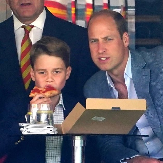 Κατά τη διάρκεια μιας διακοπής στο παιχνίδι, ο πατέρας και ο γιος σηκώθηκαν για να πάρουν μερικά αναψυκτικά, ενώ ο φακός κατέγραψε τον πρίγκιπα George να απολαμβάνει με λαχτάρα ένα κομμάτι πίτσας.