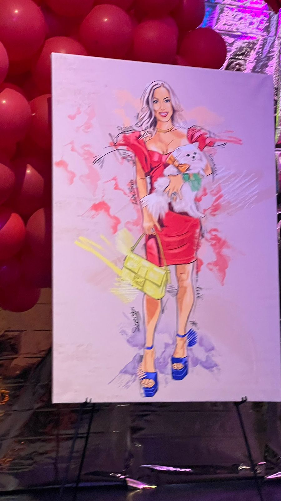 Καθώς το θέμα ήταν η αγάπη και ο έρωτας το κόκκινο χρώμα κυριαρχούσε τόσο στον χώρο και στις διακοσμήσεις αλλά και στα σύνολα των καλεσμένων. Για την περίσταση η ίδια επέλεξε ένα μίνι κόκκινο φόρεμα γεμάτο τριαντάφυλλα το οποίο συνδύασε με ασορτί κόκκινα τακούνια τα οποία είχαν επίσης τριαντάφυλλα.