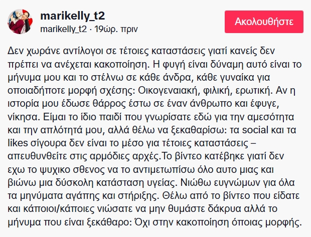 Στο βίντεο που δημοσίευσε, εμφανώς συναισθηματικά φορτισμένη, περιέγραψε έναν κύκλο έντασης, χωρισμών και επανασυνδέσεων με τον σύντροφό της, εξηγώντας ότι παρά τη στήριξη που της παρείχε σε δύσκολες περιόδους, υπήρξαν περιστατικά βίας που όπως τονίζει, δεν μπορούν να δικαιολογηθούν σε καμία περίπτωση.