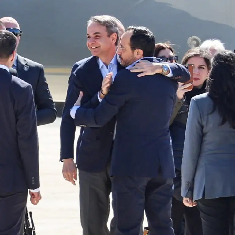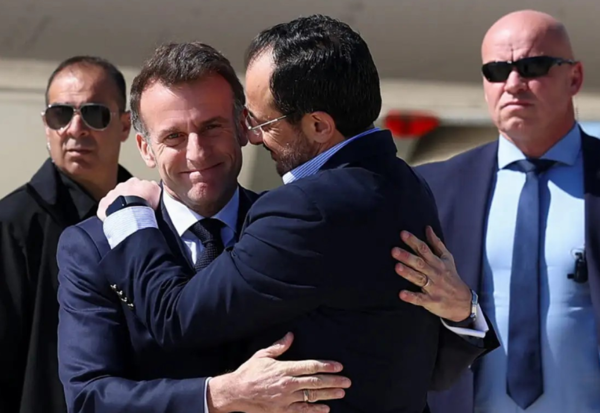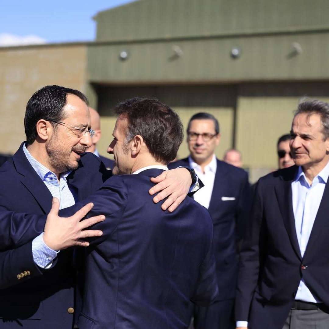 Οι Macron και Μητσοτάκης προσγειώθηκαν στην Αεροπορική Βάση Ανδρέας Παπανδρέου στην Πάφο λίγο πριν από το μεσημέρι, όπου τους υποδέχθηκε ο Νίκος Χριστοδουλίδης σε ιδιαίτερα θερμό κλίμα. Αν και η επίσκεψη είχε σαφώς πολιτικό χαρακτήρα με τριμερή συνάντηση για τις εξελίξεις στη Μέση Ανατολή και την ασφάλεια στην Ανατολική Μεσόγειο, οι εικόνες της υποδοχής έμοιαζαν περισσότερο με… reunion καλών φίλων.