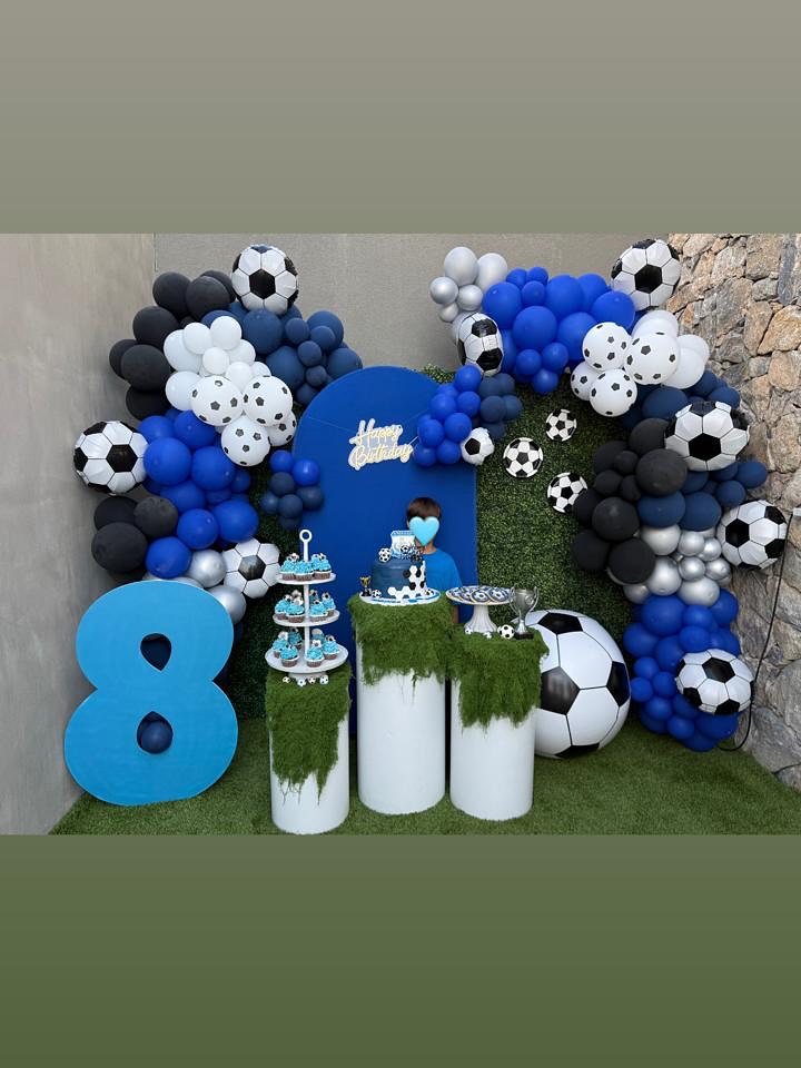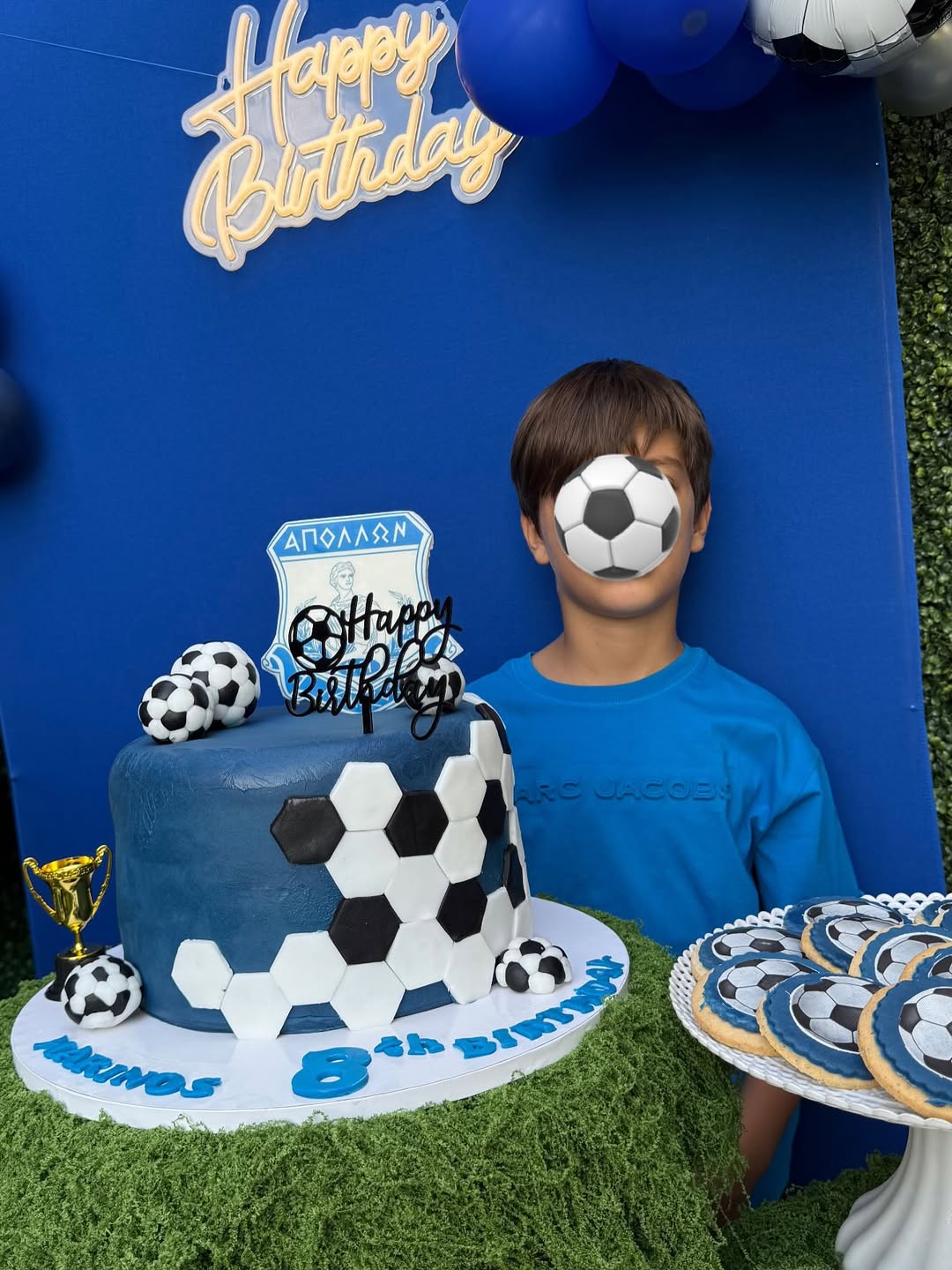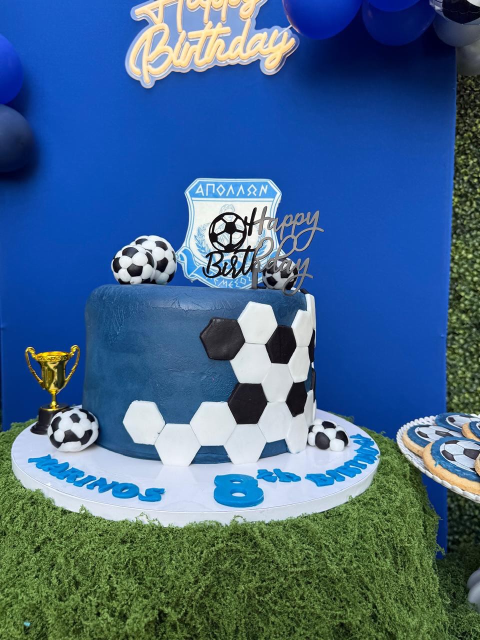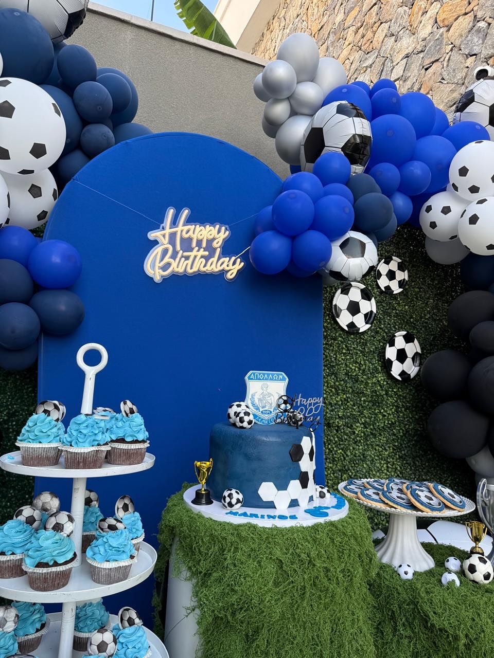 Το concept της ημέρας δεν θα μπορούσε να είναι άλλο, μπάλες, γήπεδα και πολύ… μπλε. Ο χώρος μεταμορφώθηκε σε έναν μικρό παράδεισο για κάθε μικρό ποδοσφαιρόφιλο, με μπλε μπαλόνια, πράσινο «γρασίδι», κύπελλα και θεματικά διακοσμητικά που ενθουσίασαν τους μικρούς καλεσμένους. Το τραπέζι των γλυκών ξεχώρισε με γαλάζια cupcakes και μια εντυπωσιακή τούρτα-γήπεδο εμπνευσμένη από τον Απόλλωνα, την αγαπημένη ομάδα του μικρού εορτάζοντα.