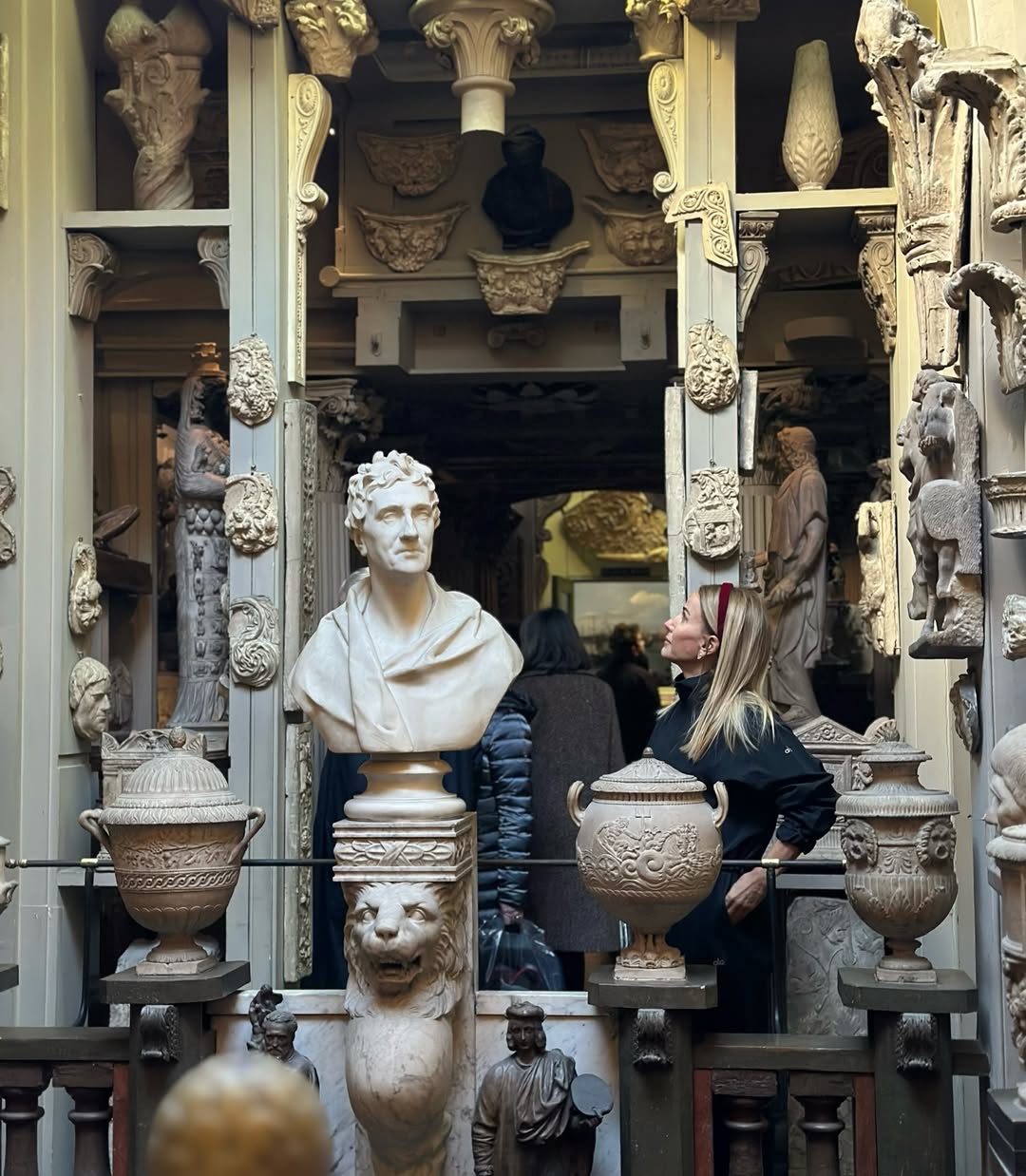 Ανάμεσα στις πρώτες στάσεις της ήταν το Sir John Soane’s Museum, ένα από τα πιο ιδιαίτερα και αρχιτεκτονικά εντυπωσιακά μουσεία της πόλης. Με τη γνωστή της αγάπη για τέχνη και design, η Έμιλυ έδειχνε να απολαμβάνει κάθε στιγμή στους ιστορικούς χώρους του.