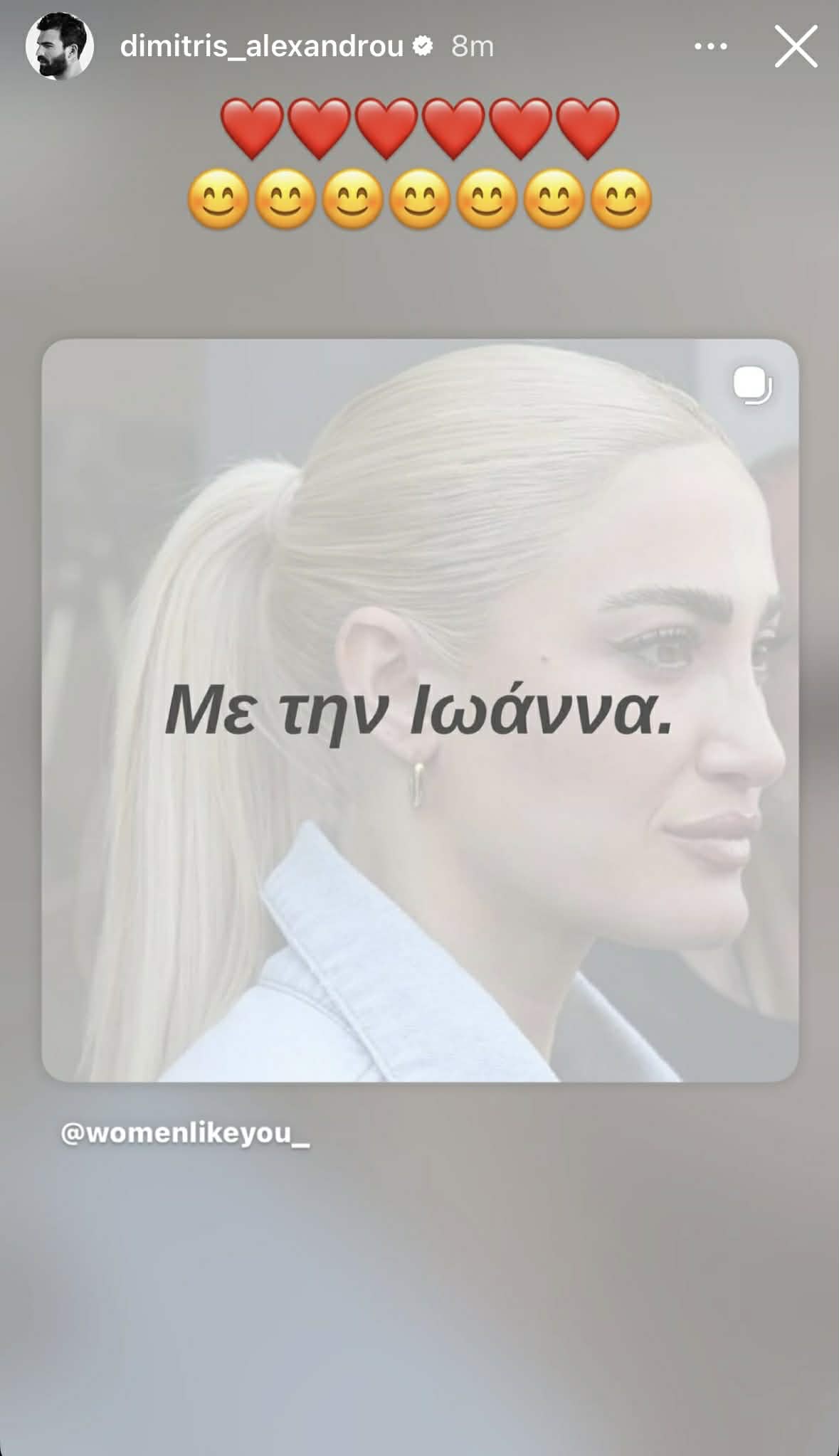 Ο επιχειρηματίας δημοσίευσε ένα story στον προσωπικό του λογαριασμό, στο οποίο εμφανιζόταν η φράση «Με την Ιωάννα», συνοδευόμενη από καρδιές που πρόσθεσε ο ίδιος, θέλοντας με αυτόν τον τρόπο να εκφράσει τη στήριξή του, αλλά και την ικανοποίησή του για την έκβαση της υπόθεσης.
