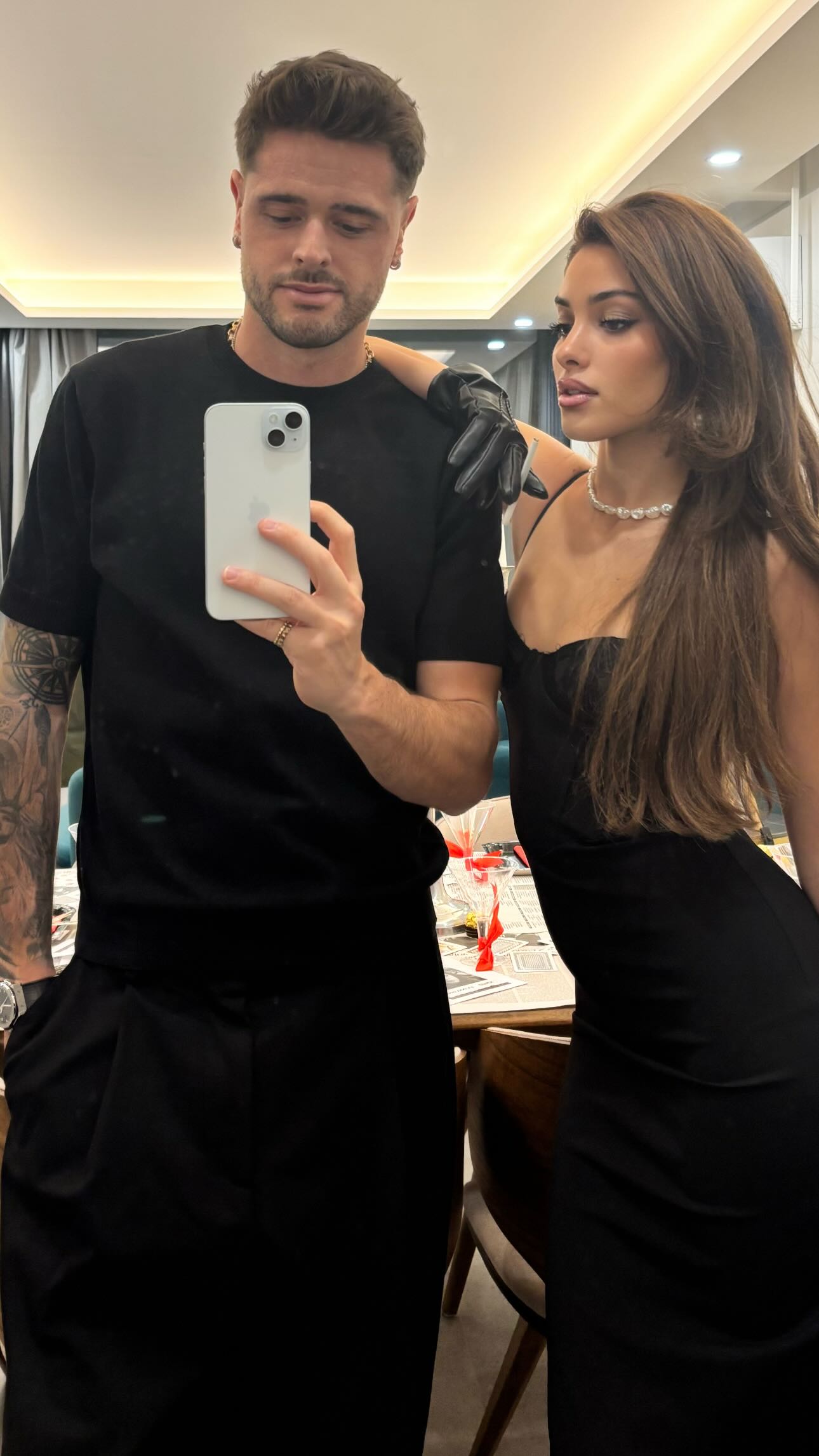 Το τραπέζι της βραδιάς ήταν μια σκηνοθετημένη εμπειρία, εφημερίδες χρησιμοποιήθηκαν ως τραπεζομάντηλα, ενώ κόκκινες λεπτομέρειες, φιόγκοι και χαρτοπετσέτες έδιναν την απόλυτη vintage πινελιά. Ανάμεσα στα σερβίτσια υπήρχαν τραπουλόχαρτα, φυλλάδια τύπου «WANTED» με τα πρόσωπα των καλεσμένων και γυναικεία τσιγάρα που ολοκλήρωναν την ατμόσφαιρα ενός πάρτι που θύμιζε παλιά ταινία gangster chic.