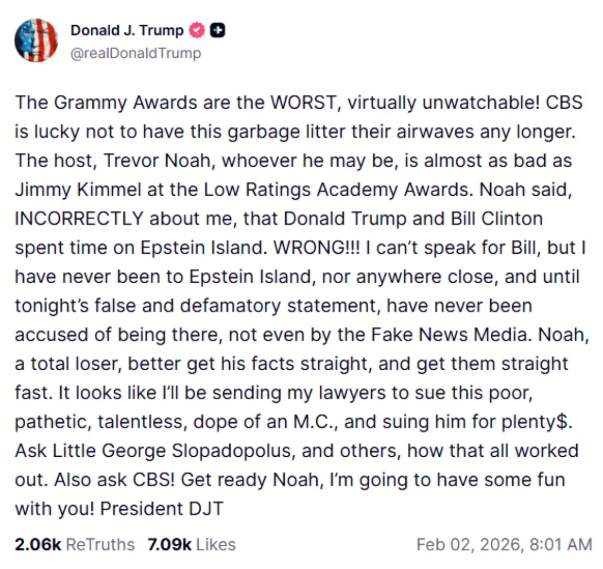 Ο Αμερικανός πρόεδρος ξέσπασε μέσω ανάρτησης στο Truth Social, χαρακτηρίζοντας την τελετή των Grammy «τη χειρότερη που μπορεί κανείς να παρακολουθήσει» και στρέφοντας τα βέλη του προσωπικά εναντίον του Trevor Noah, τον οποίο μάλιστα απείλησε ανοιχτά με νομικές ενέργειες.
