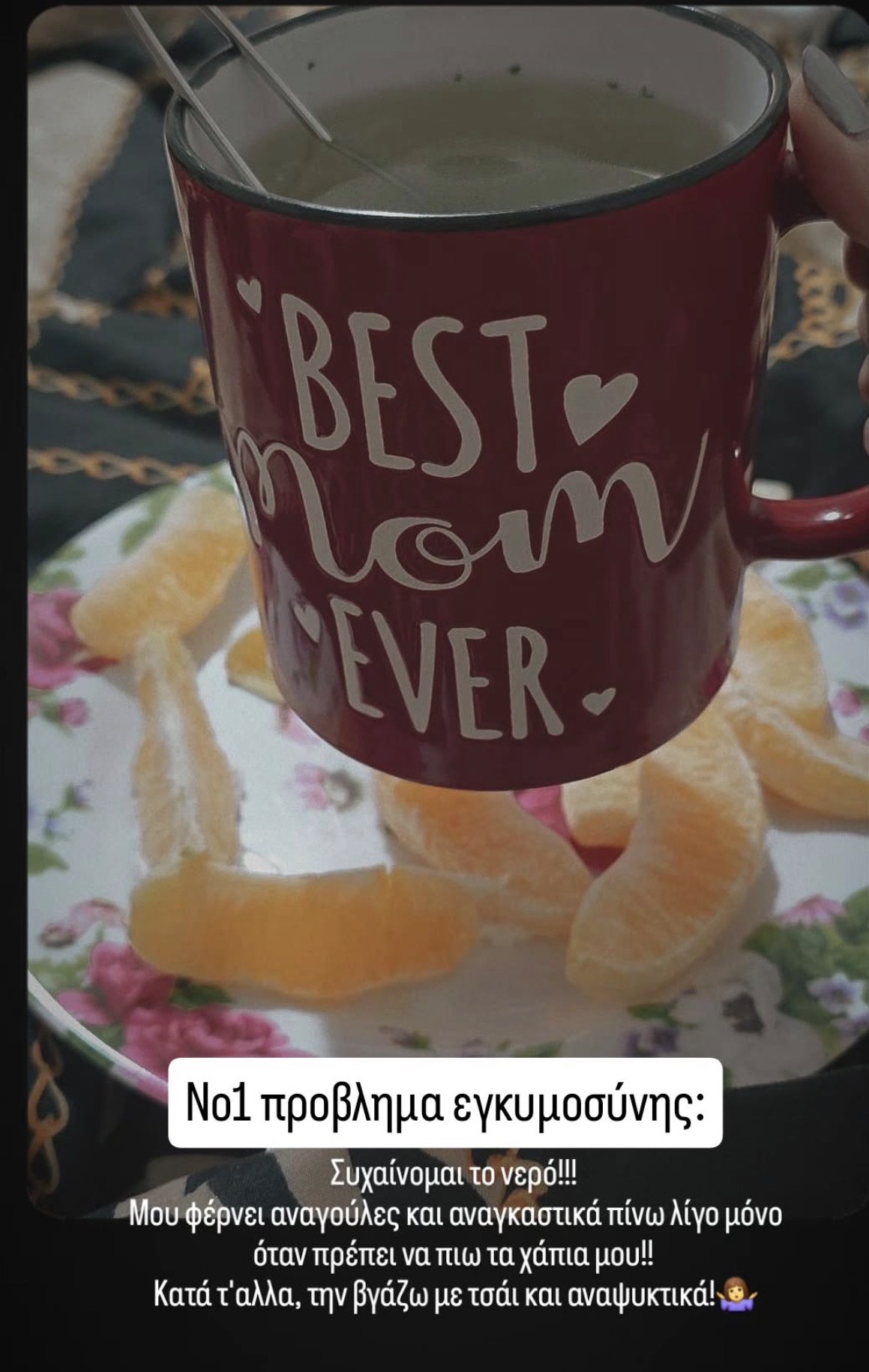 Χθες, Πέμπτη 19 Μαρτίου, προχώρησε σε μια νέα ανάρτηση μέσω Instagram story, αποκαλύπτοντας ένα πρόβλημα που αντιμετωπίζει αυτή την περίοδο. Συγκεκριμένα, έγραψε: «Νο1 πρόβλημα εγκυμοσύνης: Σιχαίνομαι το νερό. Μου φέρνει αναγούλες και αναγκαστικά πίνω λίγο μόνο όταν πρέπει να πιω τα χάπια μου. Κατά τ’ άλλα, τη βγάζω με τσάι και αναψυκτικά!».