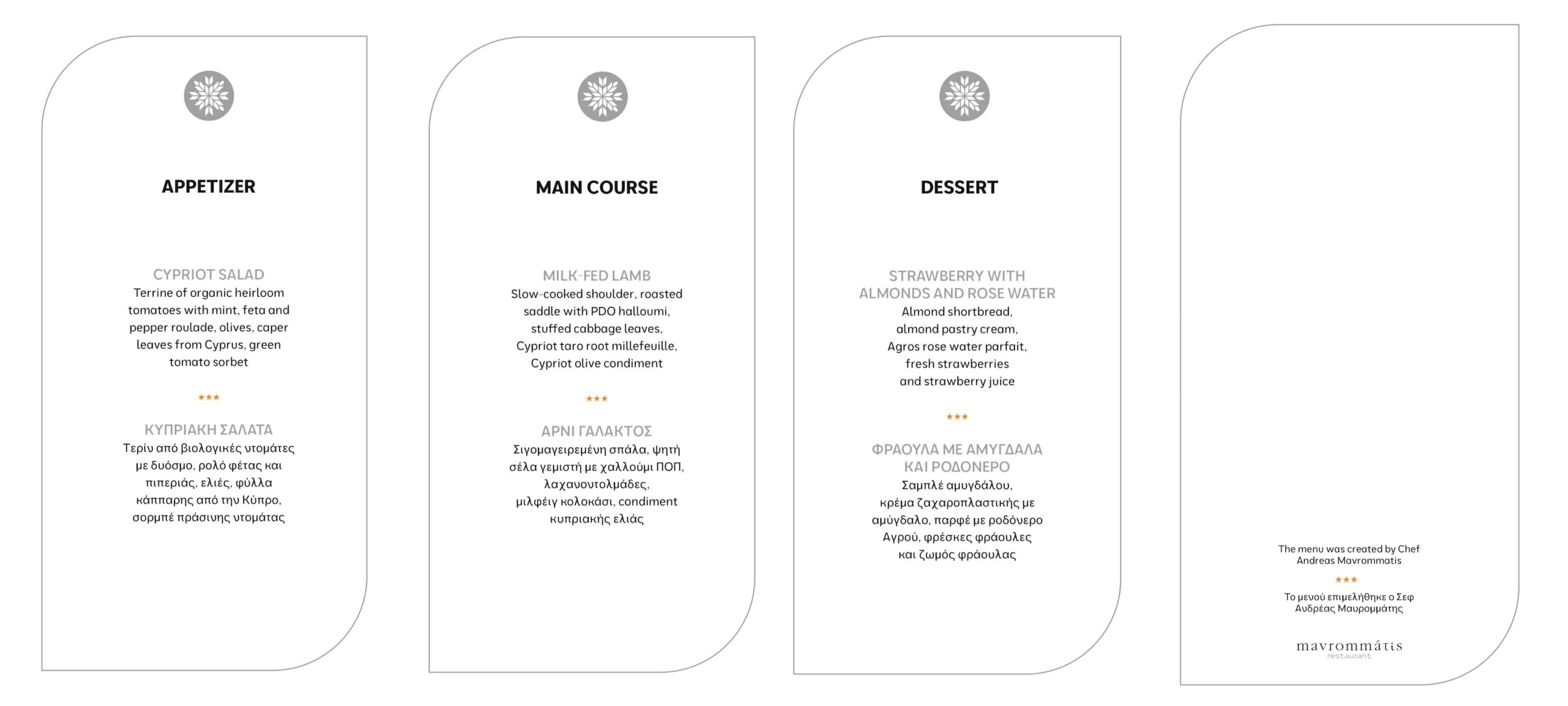Σε όλα τα μενού που παρουσιάστηκαν κατά τη διάρκεια των επίσημων γευμάτων, υπήρχε η χαρακτηριστική αναφορά ότι «το μενού επιμελήθηκε ο Σεφ Ανδρέας Μαυρομμάτης», συνοδευόμενη από το λογότυπο του ομώνυμου εστιατορίου του στο Παρίσι, ως φόρος τιμής στη σπουδαία πορεία και την προσφορά του στη γαστρονομία.