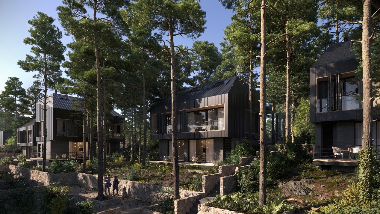 Στον εκπληκτικό περιβάλλοντα χώρο του ξενοδοχείου αναπτύσσονται όμορφες επαύλεις, μεζονέτες και studios. Η αρχιτεκτονική διατηρεί τη χαμηλή δόμηση και σέβεται τη φυσική τοπογραφία, ενσωματώνοντας τα κτίρια αρμονικά μέσα στο δάσος. Η εταιρεία bbf: προσέχει το περιβάλλον, διασφαλίζοντας τη διατήρηση των περισσότερων δέντρων. Υπάρχουν πεζόδρομοι, κοινόχρηστοι χώροι για χαλάρωση, και χώροι στάθμευσης για την άνεση των κατοίκων.