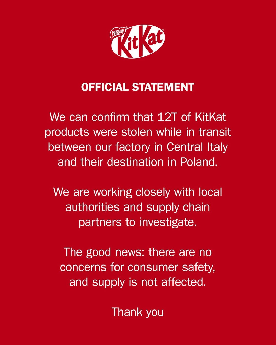 Παρά τη σοβαρότητα του περιστατικού, η εταιρεία δεν παρέλειψε να σχολιάσει και με μια δόση χιούμορ την υπόθεση. «Αν και εκτιμούμε το εξαιρετικό γούστο των δραστών, το γεγονός παραμένει ότι οι κλοπές φορτίων αποτελούν ένα αυξανόμενο πρόβλημα για επιχειρήσεις κάθε μεγέθους», ανέφερε χαρακτηριστικά η KitKat σε σχετική ανακοίνωση.