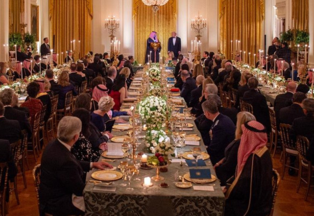 Η Ανατολική Αίθουσα του Λευκού Οίκου είχε διαμορφωθεί ειδικά για την περίσταση, μακριά τραπέζια, κεριά, κλασική διακόσμηση, αλλά με σαφές άρωμα glamour και υψηλής πολιτικής. Από τους 120 καλεσμένους, περίπου 30 ήταν μέλη της σαουδαραβικής αντιπροσωπείας, ενώ η υπόλοιπη λίστα ήταν ένα πραγματικό «who is who» της διεθνούς σκηνής. Ανάμεσα στους καλεσμένους ήταν οι Elon Musk, Tim Cook (CEO της Apple), Jensen Huang (CEO της Nvidia), στελέχη από Chevron, Qualcomm, Cisco, General Dynamics, Pfizer και άλλους επιχειρηματικούς κολοσσούς και φυσικά ο Cristiano Ronaldo, το πρόσωπο της Saudi Pro League και αρχηγός της Al-Nassr.