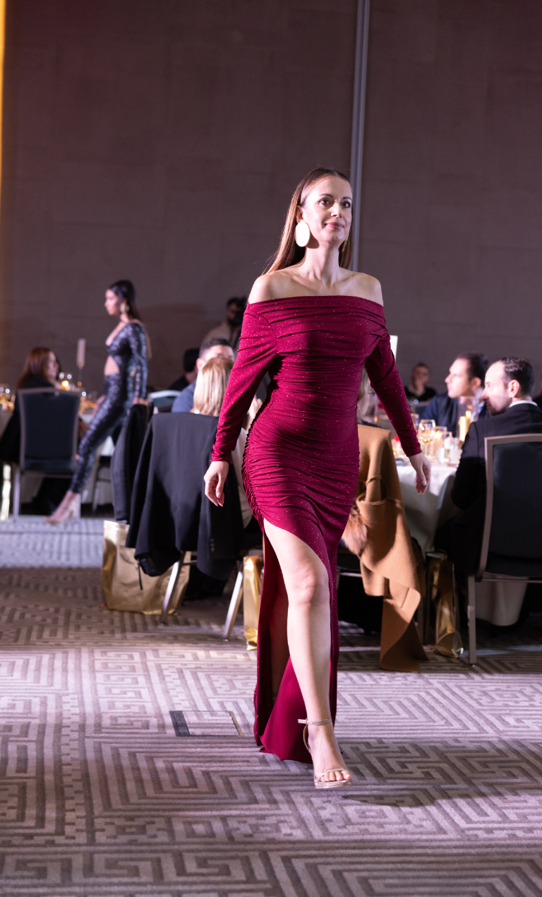 Η Αφροδίτη Δερματά εντυπωσίασε στην πασαρέλα με ένα εντυπωσιακό maxi κόκκινο φόρεμα από την Boutique Elma&Fred, το οποίο είχε ένα φινίρισμα που γυάλιζε, προσδίδοντας του λάμψη και πολυτέλεια. Οι λεπτομέρειες drape στο φόρεμα προσέθεσαν κίνηση και δυναμικό χαρακτήρα, ενώ το θηλυκό cut out στο πόδι δημιούργησε έναν διακριτικό αισθησιακό τόνο.