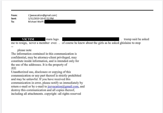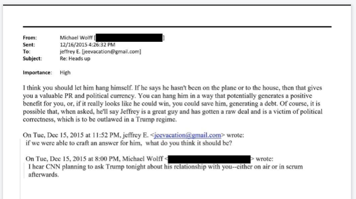 Σε email του 2015, ο συγγραφέας ενημερώνει τον Epstein ότι το CNN θα ρωτήσει τον Trump για τη σχέση τους. Ο Epstein του ζητά συμβουλές και ο Wolff απαντά: «Να τον αφήσεις να κρεμαστεί. Αν πει ότι δεν έχει πάει στο σπίτι ή το αεροπλάνο, τότε έχεις πολιτικό νόμισμα».