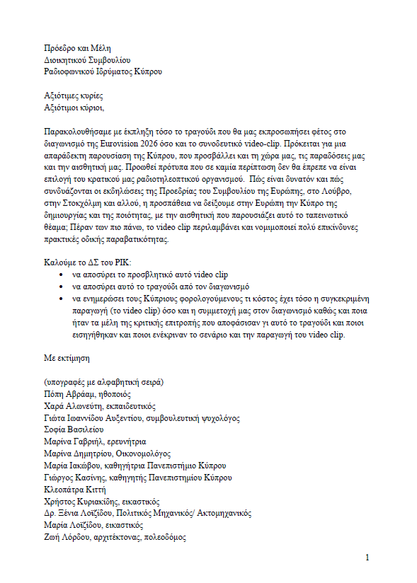 Παράλληλα, ζητούν να δημοσιοποιηθούν στοιχεία για το κόστος παραγωγής του project, τη διαδικασία επιλογής του τραγουδιού και τα πρόσωπα που ενέκριναν τη συμμετοχή.