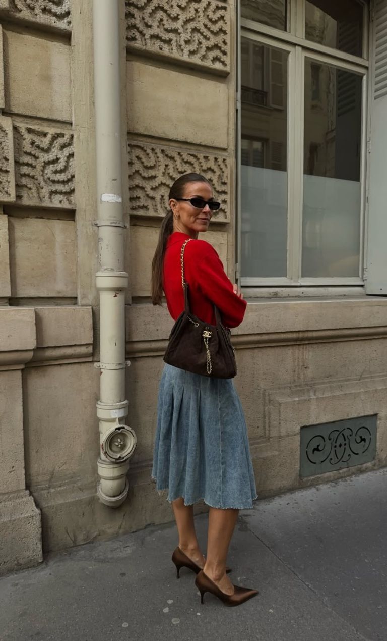 Το look της Scandi influencer Janka Polliani, που μετρά περισσότερους από 270 χιλιάδες ακόλουθους, αποπνέει effortless παριζιάνικη κομψότητα με σύγχρονο twist. Η έντονη κόκκινη μπλούζα λειτουργεί ως statement piece, δίνοντας δυναμισμό και θηλυκότητα στο σύνολο, ενώ συνδυάζεται ισορροπημένα με μια midi denim φούστα σε Α γραμμή που προσθέτει μια πιο χαλαρή, everyday αισθητική. Τα καφέ kitten heels ενισχύουν το refined vibe του συνόλου, ενώ η structured shoulder bag με χρυσή αλυσίδα αναβαθμίζει την εμφάνιση σε ένα πιο polished επίπεδο. Τα sleek μαλλιά και τα μικρά μαύρα γυαλιά ολοκληρώνουν την εικόνα της fashion influencer, δημιουργώντας ένα σύνολο που κινείται ανάμεσα στο minimal chic και το quiet luxury. Άκρως ιδανικό για city strolls με fashion-forward διάθεση.