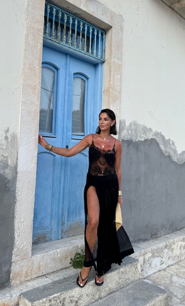 Η Ραμόνα φόρεσε ένα μαύρο maxi φόρεμα από σατέν με δαντελένιες λεπτομέρειες, που είναι η πιο κομψή τάση του καλοκαιριού. Το σατέν υλικό προσφέρει μια απαλή αίσθηση και μια ελαφριά γυαλάδα, ενώ οι δαντελένιες προσθήκες προσθέτουν μια πινελιά ρομαντισμού και πολυτέλειας. Το φόρεμα έχει μια σαγηνευτική και θηλυκή γραμμή που αγκαλιάζει το σώμα με στυλ, κάνοντάς το ιδανικό για βραδινές εξόδους ή για ξεχωριστές περιστάσεις.