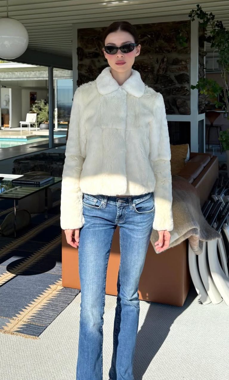 Η Nicola Peltz απογειώνει το casual με ένα σύγχρονο, μινιμαλιστικό twist. Το λευκό faux-fur jacket προσθέτει μια αίσθηση πολυτέλειας και ενδιαφέρουσας υφής στην εμφάνισή της, ενώ το τζιν με subtle flare δημιουργεί αρμονική ισορροπία και μακραίνει τη σιλουέτα, χαρίζοντας effortless κομψότητα. Τα slim μαύρα γυαλιά ηλίου εισάγουν μια urban, street-style edge αισθητική, ενώ τα μαλλιά πιασμένα πίσω και το διακριτικό μακιγιάζ αφήνουν το outfit να μιλήσει από μόνο του. Το αποτέλεσμα είναι ένα fashion-forward, προσιτό look που συνδυάζει άνεση και sophistication, ιδανικό για μια urban daytime εμφάνιση με έντονο style attitude. Πρόκειται για ένα σύνολο που δεν θα δυσκολευτείτε να αναδημιουργήσετε, και να το φορέσετε από το γραφείο μέχρι το dinner date με τον αγαπημένο σας.