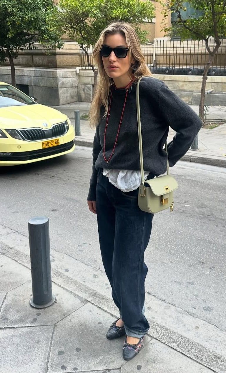 Το look ολοκληρώνεται με σκούρο τζιν, μπαλαρίνες και μια structured τσάντα σε λεμονί απόχρωση που δίνει τη σωστή νότα φωτός στο σύνολο. Ένα μακρύ κόκκινο κολιέ με χάντρες και τα κλασικά Ray-Ban συμπληρώνουν το #ootd της, δημιουργώντας μια εμφάνιση άνετη, στυλάτη και απόλυτα ισορροπημένη.