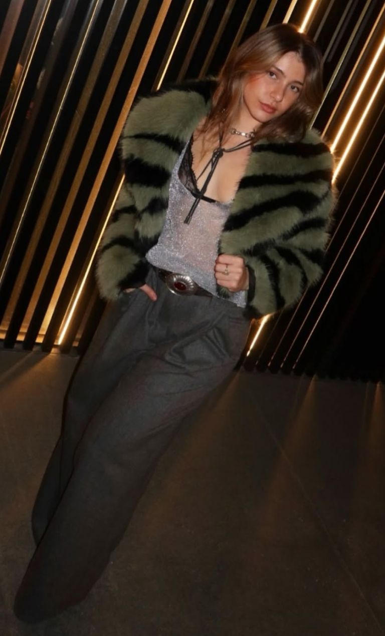 Το look της Αναστασιας Μούσκου αποπνέει μια σύγχρονη, ανεπιτήδευτα glamorous αισθητική που ισορροπεί ανάμεσα στο statement και το effortless cool. Το πράσινο faux-fur jacket με τις μαύρες ρίγες λειτουργεί ως το απόλυτο fashion centerpiece, προσθέτοντας ένταση και υφή στο σύνολο, ενώ το λαμπερό ασημί top από μέσα χαρίζει μια διακριτική δόση νυχτερινής λάμψης. Το ψηλόμεσο γκρι παντελόνι κρατά τη σιλουέτα κομψή και χαλαρή, δίνοντας μοντέρνο tailoring χαρακτήρα, ενώ η ζώνη με τη στρογγυλή αγκράφα προσθέτει μια retro πινελιά. Τα layered κολιέ ολοκληρώνουν το styling με μια edgy λεπτομέρεια, δημιουργώντας ένα outfit που θυμίζει σύγχρονο street style με high-fashion διάθεση.