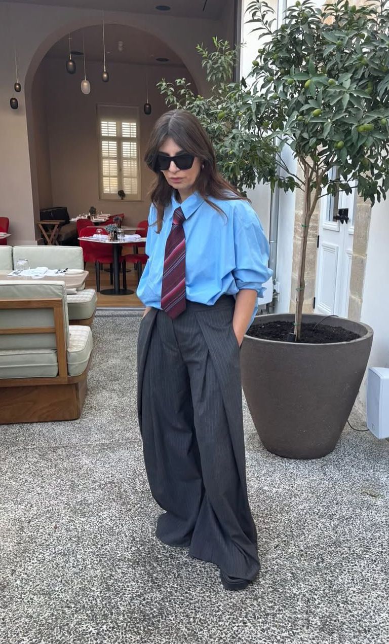 Η Τόνια Αριστοτέλους υιοθετεί ένα έντονα ανδρόγυνο και oversized look με high-fashion attitude. Στην φωτογραφία τη βλέπουμε να ποζάρει με ένα φαρδύ γαλάζιο πουκάμισο με χαλαρά γυρισμένα μανίκια, συνδυασμένο με μια κλασική μπορντό ριγέ γραβάτα που προσθέτει έναν 90s business χαρακτήρα στο όλο σύνολο. Το γκρι, ριγέ παντελόνι σε φαρδιά γραμμή και εναλλακτικές πτυχώσεις, δημιούργησε μια εντυπωσιακή, ρευστή σιλουέτα που παραπέμπει σε masculine tailoring.