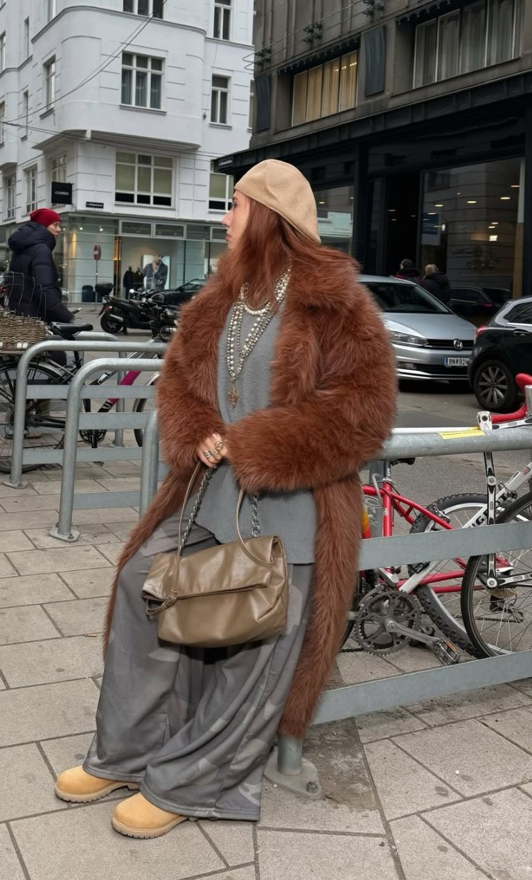 Η εμφάνιση της Άντρεας Παπαϊωάννου βασίζεται σε γήινες αποχρώσεις και ένα πολύ ενδιαφέρον layering. Το βλέμμα τραβά αμέσως το μακρύ, καφέ faux fur παλτό, που προσθέτει όγκο, υφή και μια διακριτική luxury αισθητική στην όλη εμφάνιση της. Από μέσα, ένα γκρι, χαλαρής γραμμής σύνολο δημιουργεί μια άνετη, relaxed βάση που ισορροπεί τέλεια με το statement πανωφόρι. Το beige καπέλο προσθέτει cool, city vibes και ολοκληρώνει χρωματικά το σύνολο, ενώ τα layered κολιέ με πέρλες χαρίζουν μια απρόσμενη κομψότητα και δημιουργούν όμορφη αντίθεση με το casual ύφος του outfit. Η μικρή taupe τσάντα διατηρεί το look πρακτικό αλλά ταυτόχρονα polished, ενώ τα camel boots ενισχύουν τη ζεστή χρωματική παλέτα και το κάνουν ιδανικό για city walks. Συνολικά, η Άντρεα δημιούργησε ένα σύγχρονο street style look που συνδυάζει άνεση και ενδιαφέρουσες υφές.