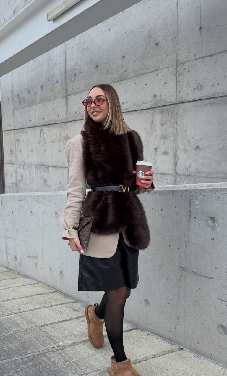 Σε ένα σύγχρονο urban σκηνικό, το look της Μιχαήλιας Ανδρέου αποπνέει ανεπιτήδευτη κομψότητα και χειμερινό sophistication. Το μπεζ σακάκι λειτουργεί ως σταθερή βάση, ενώ η σκούρα faux γούνινη εσάρπα προσθέτει υφή και αίσθηση πολυτέλειας. Το μαύρο δερμάτινο σορτς σε συνδυασμό με το καλσόν δημιουργεί μια δυναμική αντίθεση ανάμεσα στο κλασικό και το μοντέρνο, ενώ τα καφέ suede ankle μποτάκια ολοκληρώνουν το σύνολο με μια ζεστή, γήινη πινελιά. Ένα city chic look που ισορροπεί ανάμεσα στην άνεση και τo style, άκρως ιδανικό για καθημερινές εμφανίσεις με editorial χαρακτήρα.
