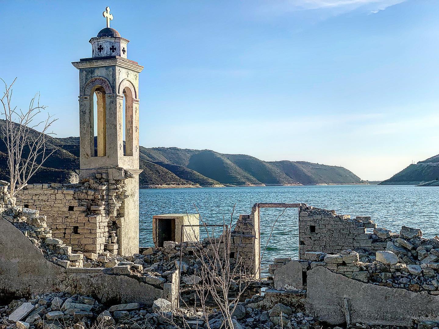 Η εκκλησία χτίστηκε το 1936, όμως σήμερα δεν τη βλέπεις πάντα, εμφανίζεται μόνο όταν πέφτει η στάθμη του νερού του φράγματος, σαν ένα κομμάτι ιστορίας που αναδύεται για λίγο και μετά χάνεται ξανά. Το μοναδικό στοιχείο που στέκεται ακόμα όρθιο είναι το καμπαναριό.