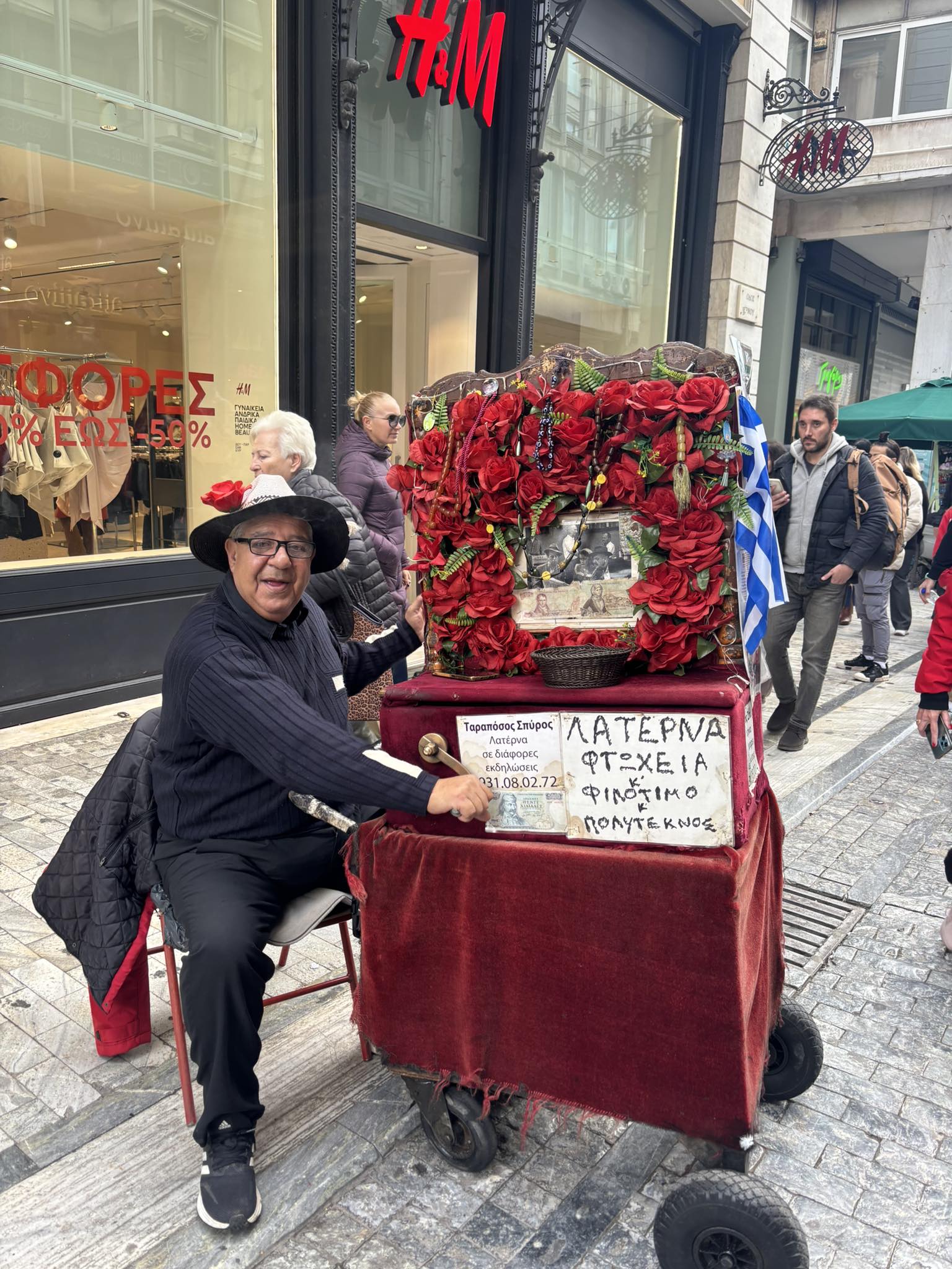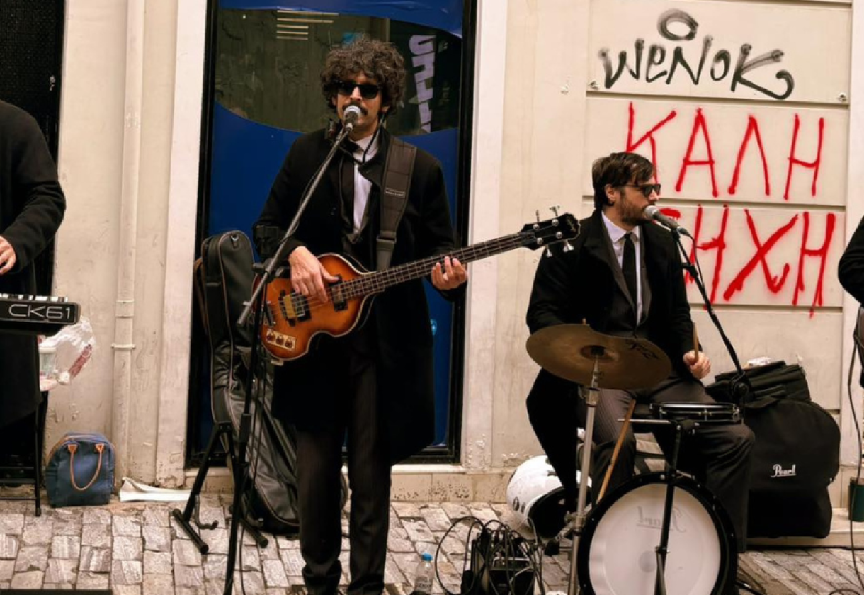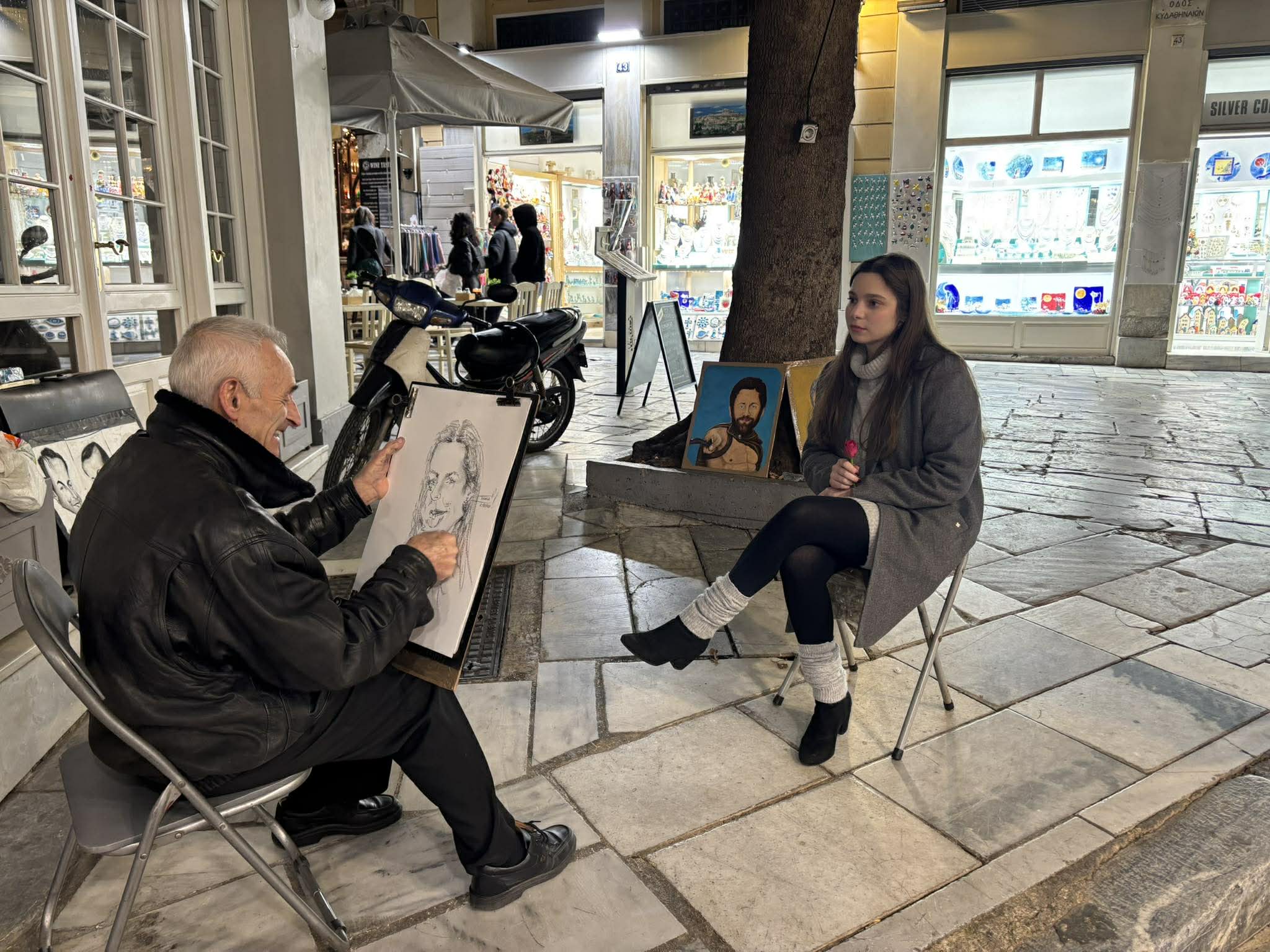 Ανάμεσα στο πλήθος, ένα συγκρότημα με vibe Beatles τραγουδά στην άκρη του δρόμου. Οι κιθάρες τους χάνουν λίγο από τον ήχο τους μέσα στο βουητό της πόλης, αλλά κάποιοι σταματούν, κοιτάζουν και χαμογελούν. Λίγο πιο κάτω, ένας πλανόδιος ζωγράφος φτιάχνει γελοιογραφίες, χαρίζει μικρές ιστορίες σε χαρτί. Μας μίλησε για τη ζωή του, για τις διαδρομές του, για το πώς η τέχνη του έγινε τρόπος επιβίωσης και ταυτόχρονα τρόπος να μην χαθεί.
