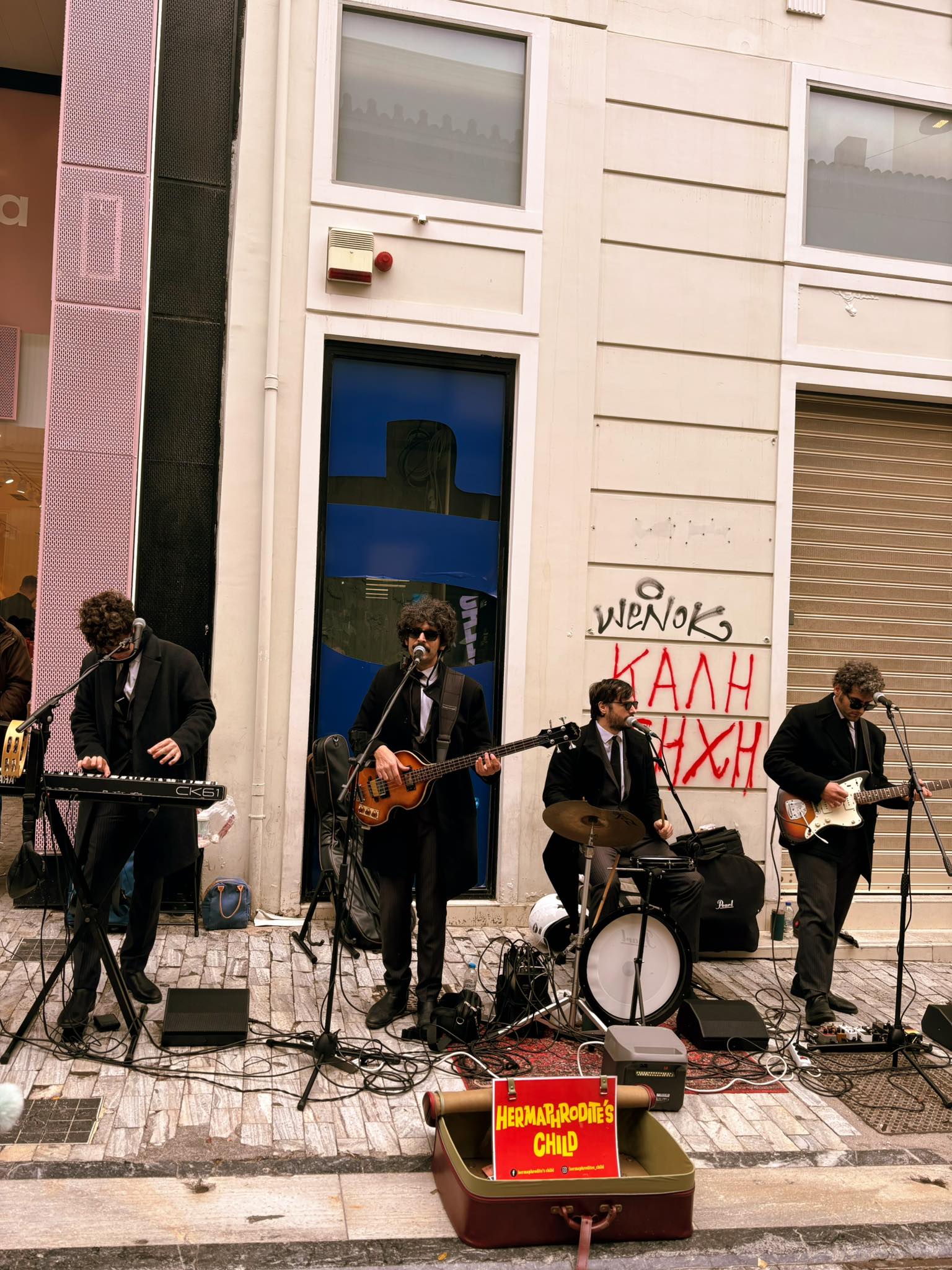 Εκεί κάπου, μέσα στο περπάτημα, βλέπω κόσμο μαζεμένο και ακούω υπέροχη μουσική. Μια μπάντα με vibe των Beatles, ένα συγκρότημα με το όνομα «Hermaphrodite's Child» που σε ταξιδεύει πίσω στις δεκαετίες του ’50 και του ’60, αναβιώνοντας τον αυθεντικό ήχο που διαμόρφωσε τη σύγχρονη μουσική. Με μια μόνο ματιά καταλαβαίνεις τη διαφορά, ο κόσμος γύρω τους είναι πιο χαλαρός. Σταματά, ακούει και χορεύει λίγο αδέξια στο πεζοδρόμιο. Κι εκείνοι τραγουδούν με πάθος, με αγάπη γι’ αυτό που κάνουν, όχι σαν επάγγελμα, αλλά σαν ανάγκη.