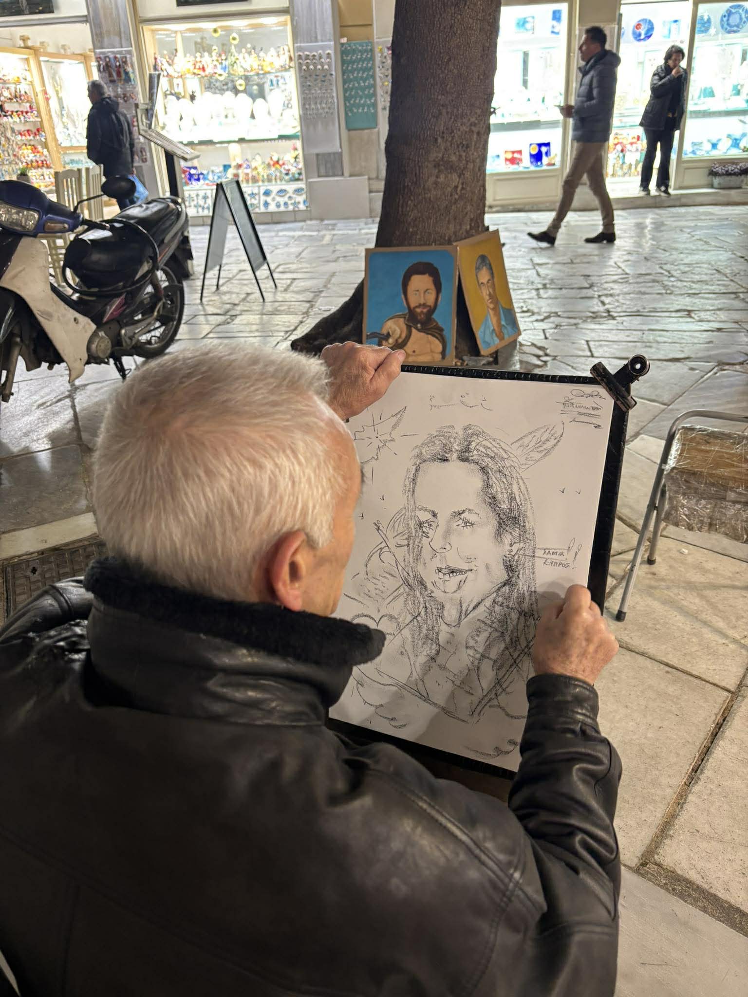 Πάντα χαμογελαστός. Ντυμένος στα μαύρα, με παπούτσια καλογυαλισμένα, σαν μια φιγούρα άλλης εποχής μέσα στη σημερινή Αθήνα. Αυτή τη δουλειά την κάνει από το 1998 μέχρι σήμερα, το 2026. Δεν παντρεύτηκε ποτέ. Όλη του η ζωή ήταν αυτές οι γειτονιές, αυτά τα πεζοδρόμια, αυτά τα πρόσωπα που περνούσαν μπροστά του. Ένας αυτόπτης μάρτυρας της αλλαγής της πόλης. Με 10 ευρώ, μέσα σε 5-10 λεπτά, έχεις τη δική σου γελοιογραφία, ένα μικρό κομμάτι από το βλέμμα του πάνω σου.