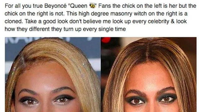 Ας ξεκινήσουμε από τα βασικά, όταν υπάρχει θεωρία συνωμοσίας για διασημότητες, η Beyoncé είναι πάντα στη λίστα. Η πιο πρόσφατη θεωρία θέλει τη Queen B να έχει φύγει από τη ζωή το 2000 και να την έχει αντικαταστήσει ένας κλώνος που λειτουργεί υπό τις εντολές μυστικών μασονικών στοών. Η θεωρία φούντωσε όταν ο χρήστης Stephen J Thomas στο Facebook ανέβασε δύο φωτογραφίες της Beyoncé γράφοντας: «Η κοπέλα στα αριστερά είναι η πραγματική Beyoncé. Η δεξιά; Κλώνος. Μην με πιστεύετε, ψάξτε όλες τις διασημότητες». Άλλοι χρήστες, με διάθεση Sherlock Holmes αλλά χωρίς τα στοιχεία, υποστήριξαν ότι η Beyoncé «πέθανε» όταν σύμφωνα με τη φαντασία τους εξερράγη σε αυτοκίνητο και επέστρεψε ως η alter ego «Sasha Fierce».