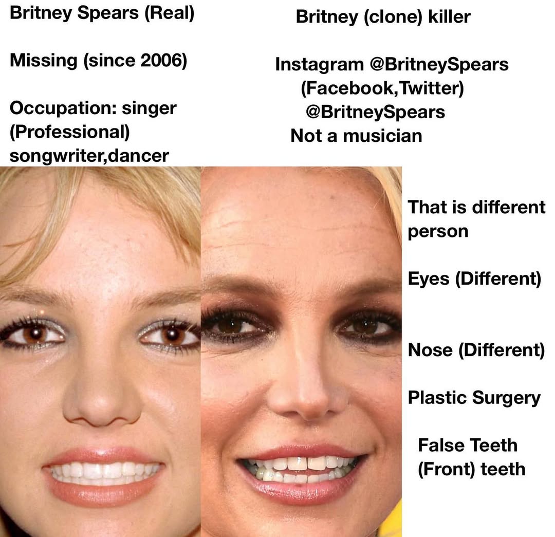Μετά την έναρξη της επιμέλειας και την παρατεταμένη απουσία της Britney από τα media, πολλοί fans άρχισαν να πιστεύουν πως η παγκόσμια pop star έχει αντικατασταθεί από μια σωσία ή ακόμη και από κλώνο. Οι αλλαγές στη συμπεριφορά, στην εμφάνιση, ακόμη και στη φωνή της σε κάποια videos έκαναν τις θεωρίες να φουντώσουν. Παρ’ όλα αυτά, η Britney έχει αρνηθεί επανειλημμένα τέτοιους ισχυρισμούς, τονίζοντας ότι οι εικασίες αυτές την πληγώνουν.
