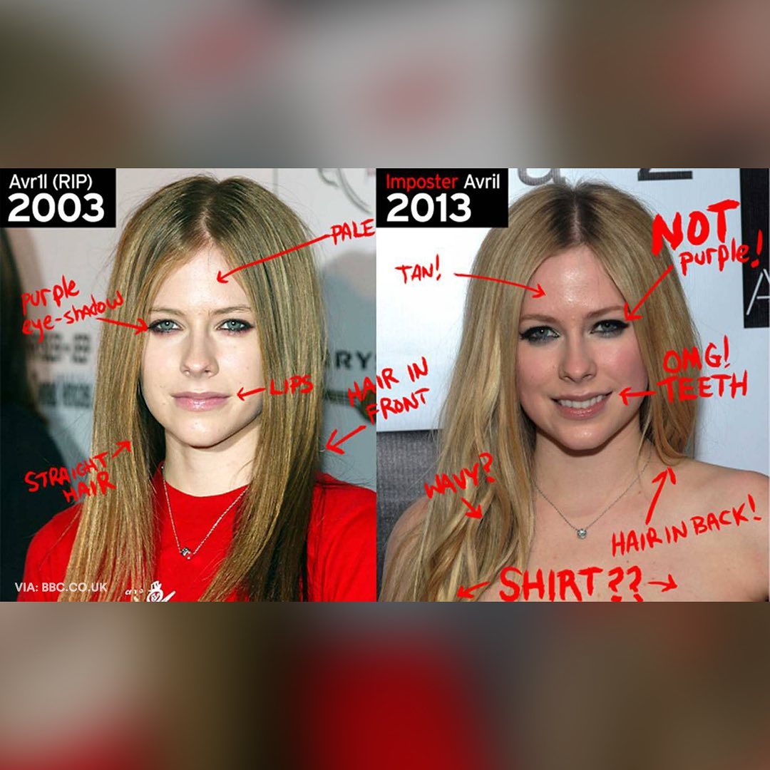 Αυτή είναι ίσως η πιο αγαπητή θεωρία του ίντερνετ, κυρίως γιατί είναι απίστευτα λεπτομερής. Σύμφωνα με fans της Avril στη Βραζιλία η Avril πέθανε το 2003, είχε μια σωσία, τη Melissa και η δισκογραφική την «ανέλαβε» και κάπως έτσι η Melissa έγινε Avril Lavigne. Κάποιοι μάλιστα δείχνουν φωτογραφίες όπου το χέρι της γράφει Melissa (spoiler: είναι μοντάζ). Άλλοι συγκρίνουν φωτογραφίες με διαφορετικά σχήματα μύτης και λένε: «Δες! Η μύτη άλλαξε». Λες και κανείς δεν έχει κάνει ρινοπλαστική στη ζωή του.