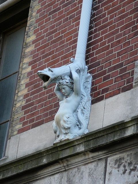 Κοιτάζοντας αυτή τη λεπτομέρεια σε πρόσοψη κτιρίου, καταλαβαίνεις αμέσως πώς κάποτε η λειτουργικότητα συνδυαζόταν με την τέχνη. Μια απλή υδρορροή δεν ήταν απλώς σωλήνας αποχέτευσης νερού, γινόταν γλυπτό. Η γυναικεία φιγούρα, τα διακοσμητικά στοιχεία, η έκφραση, όλα δείχνουν ότι κάποιος τεχνίτης αφιέρωσε χρόνο και φαντασία. Ήταν μια εποχή όπου ακόμα και τα «δευτερεύοντα» μέρη ενός κτιρίου είχαν χαρακτήρα.