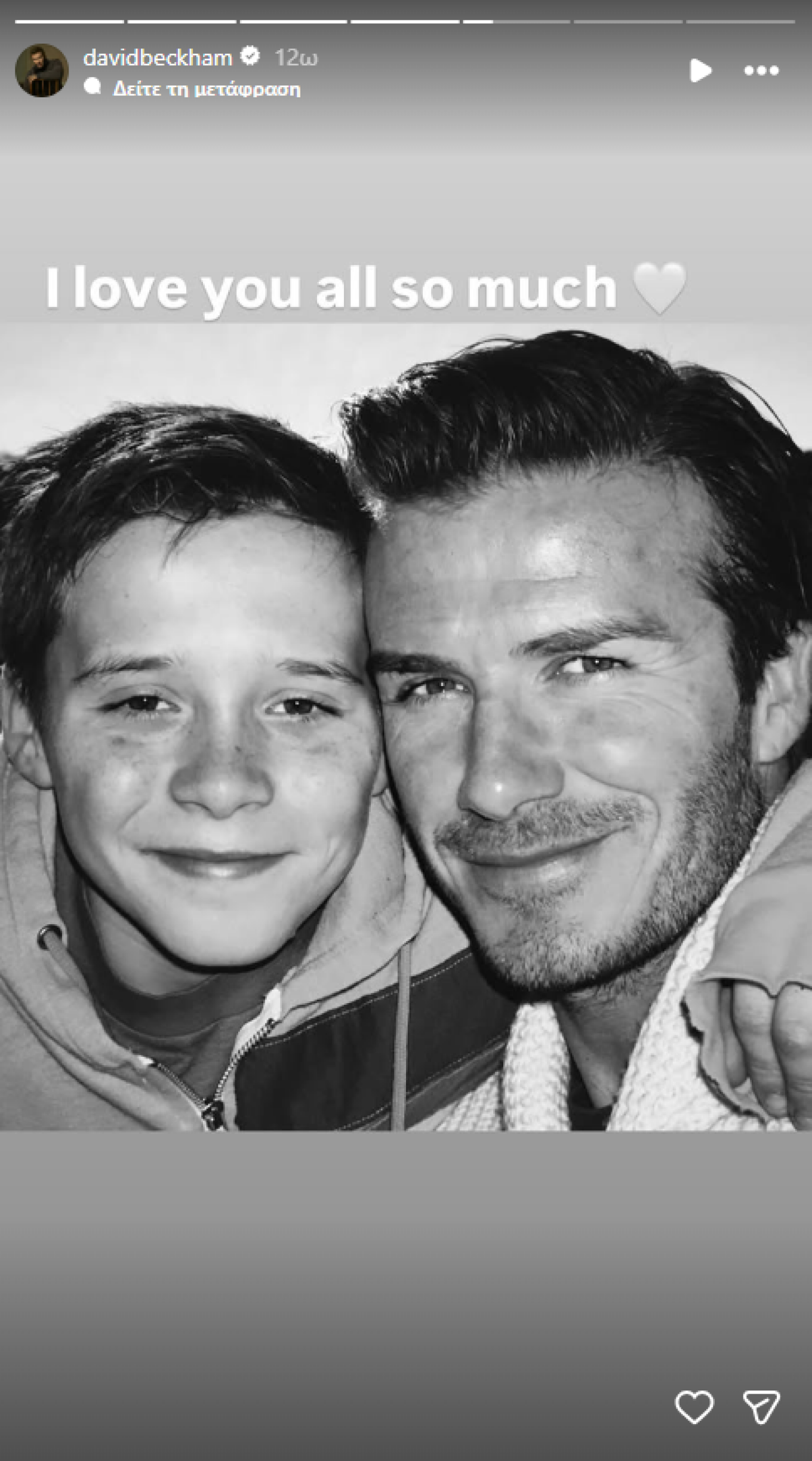 Περίπου οκτώ ώρες μετά την αρχική ανάρτηση, ο David Beckham μοιράστηκε μια ασπρόμαυρη φωτογραφία όπου ποζάρει με τον Brooklyn σε μικρή ηλικία, συνοδεύοντάς τη με ένα λιτό αλλά φορτισμένο μήνυμα αγάπης: «Σας αγαπώ όλους πάρα πολύ».