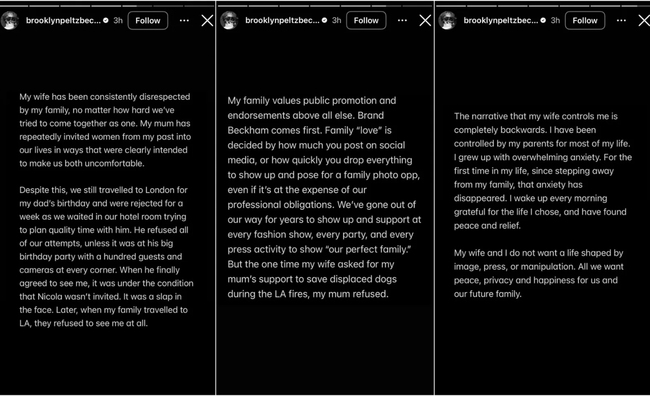 Ο Brooklyn Beckham δημοσίευσε ένα Instagram story έξι διαφανειών, στο οποίο εξαπέλυσε σφοδρή επίθεση. Δήλωσε ότι είχε παραμείνει σιωπηλός για χρόνια, αλλά αναγκάστηκε να μιλήσει επειδή οι γονείς του και η ομάδα τους συνέχιζαν να διαρρέουν πληροφορίες στον Τύπο. Τόνισε ότι δεν επιθυμεί συμφιλίωση και ότι για πρώτη φορά στη ζωή του υπερασπίζεται τον εαυτό του.