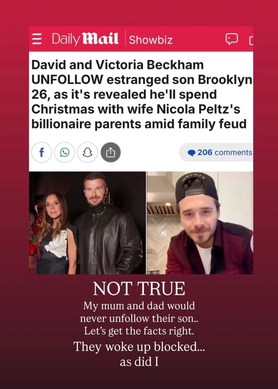 Ο Cruz Beckham διέψευσε δημοσίευμα της Daily Mail που ήθελε τους γονείς του να έχουν κάνει unfollow τον Brooklyn, εξηγώντας ότι όλοι ξύπνησαν μπλοκαρισμένοι. Μέχρι τότε, ο Brooklyn δεν ακολουθούσε κανένα μέλος της οικογένειας στο Instagram, με εξαίρεση τη φωτογραφική σελίδα του Romeo. Η Nicola επίσης δεν ακολουθεί τα πεθερικά της.